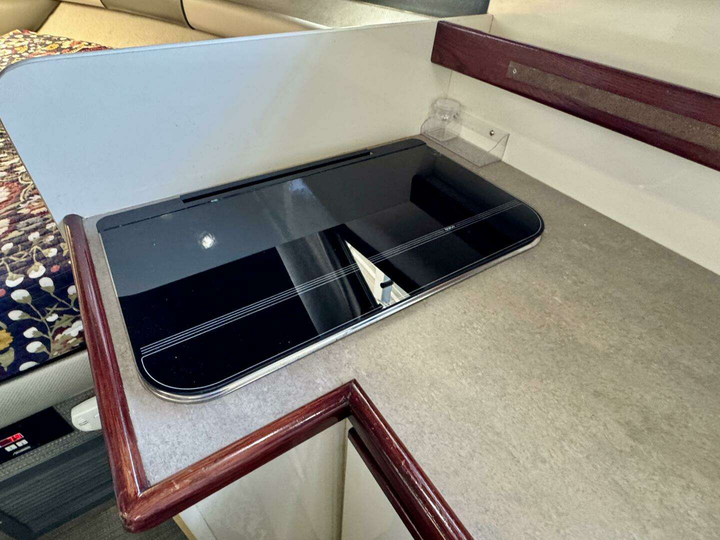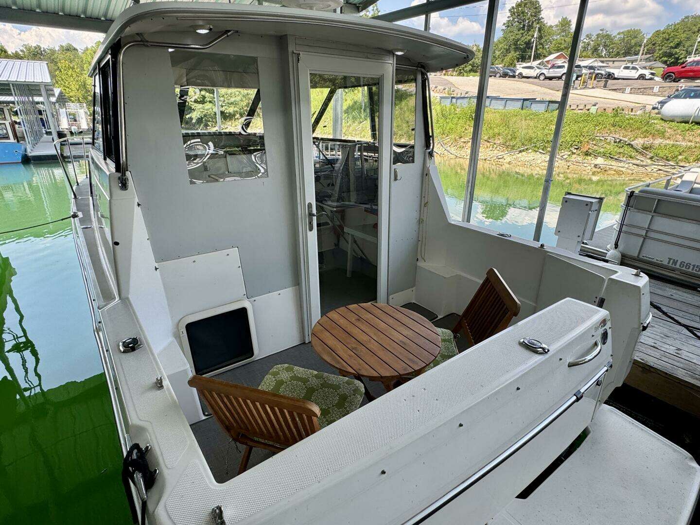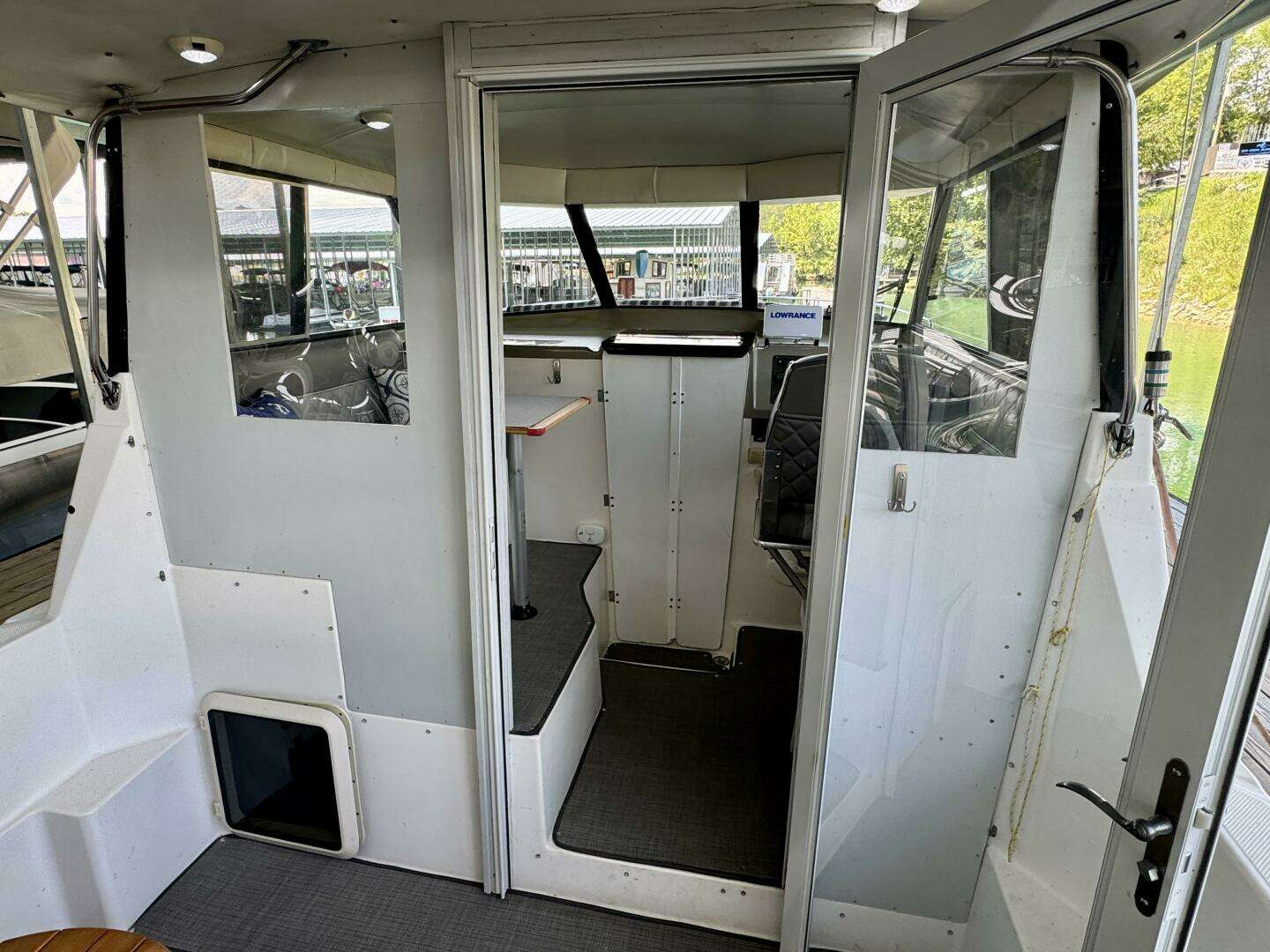 This 1997 Bayliner 2859 Hard Top Ciera Express Special Edition Cabin Cruiser For Sale on Norris Lake Tennessee is equipped with a 7.4L MerCruiser 454 V8 inboard/outboard engine with Bravo II outdrive and features an enclosed cockpit with a hard top and an extended rear bimini top with issenglass camper canvas enclosure (bimini & enclosure - not shown), an updated interior with new upholstery and woven vinyl flooring throughout as well as snap-in woven vinyl cockpit flooring, a convertible dinette, V-berth, and mid-cabin sleeping berths (sleeps 5-6), a Norcold AC/DC fridge, dual burner alcohol/electric range, microwave, galley sink, head compartment with manual wet head & shower, reverse cycle marine air conditioning with heat, a water heater, bow cushions, a removable cockpit table, recent engine and outdrive service (recent tune up, impeller, engine/drive fluid changes, new bellows, anodes, drive shift cable & more, bottom paint checked and was in good condition at last haul out), plus a transferable covered slip on Norris Lake TN!
