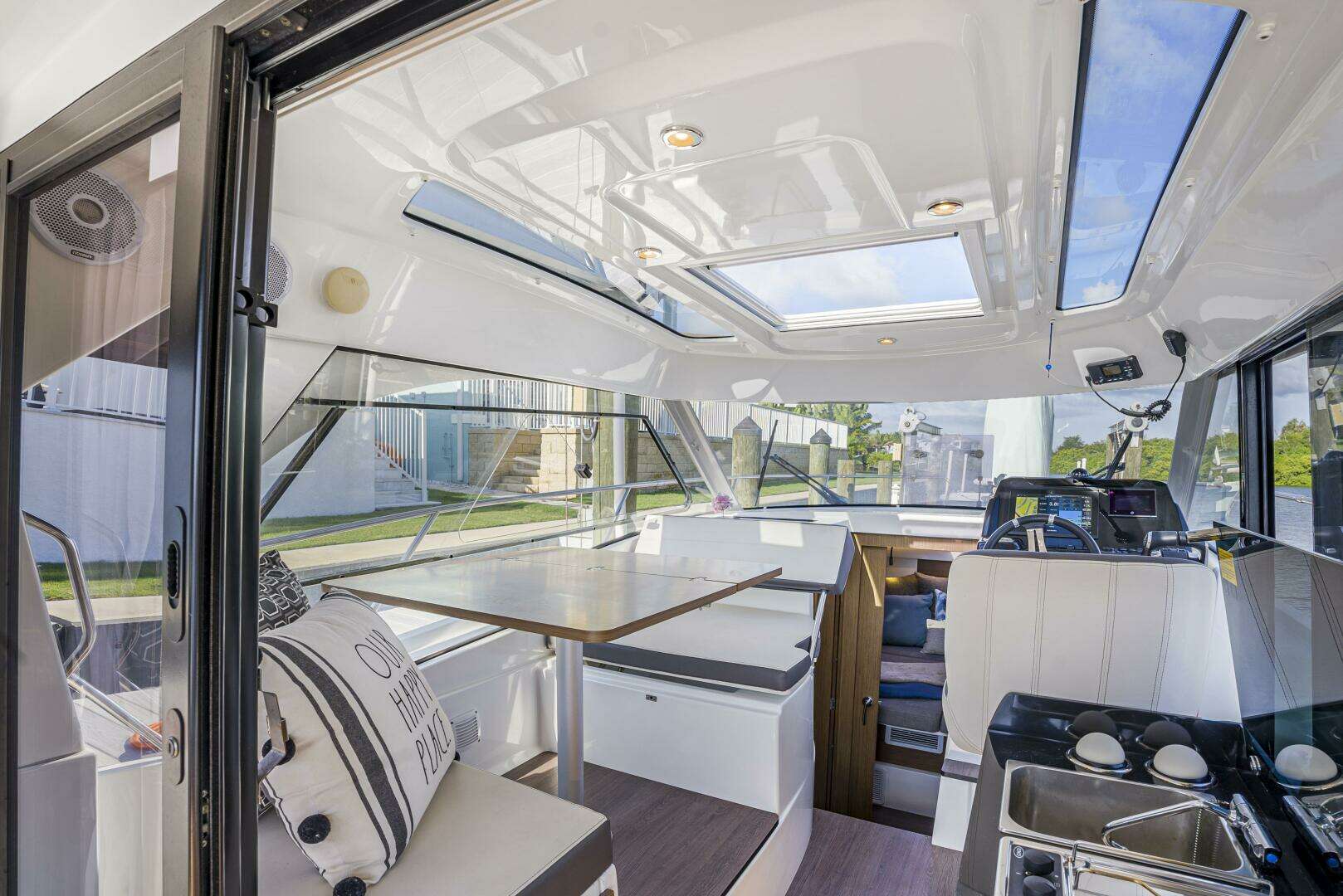 Step inside and you’ll find a bright salon with wraparound windows, a convertible dinette, and a well-equipped galley designed for longer trips. Below deck, a private forward cabin and side guest berth provide overnight accommodations for four, while the enclosed head with shower ensures comfort.