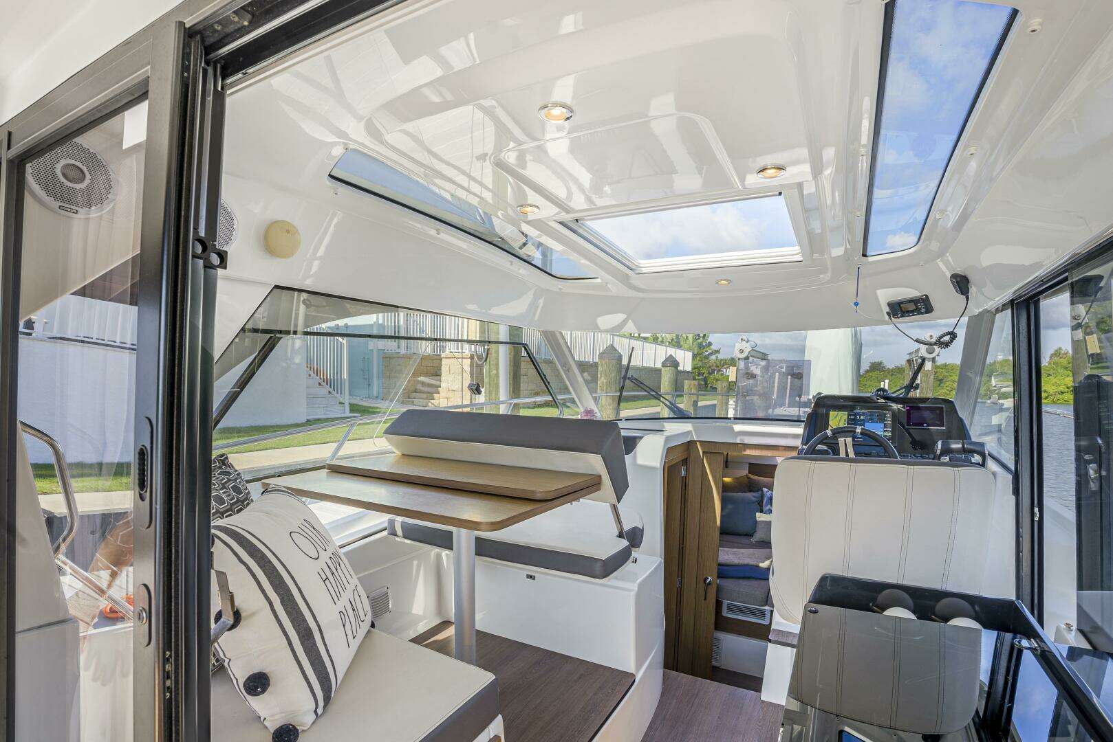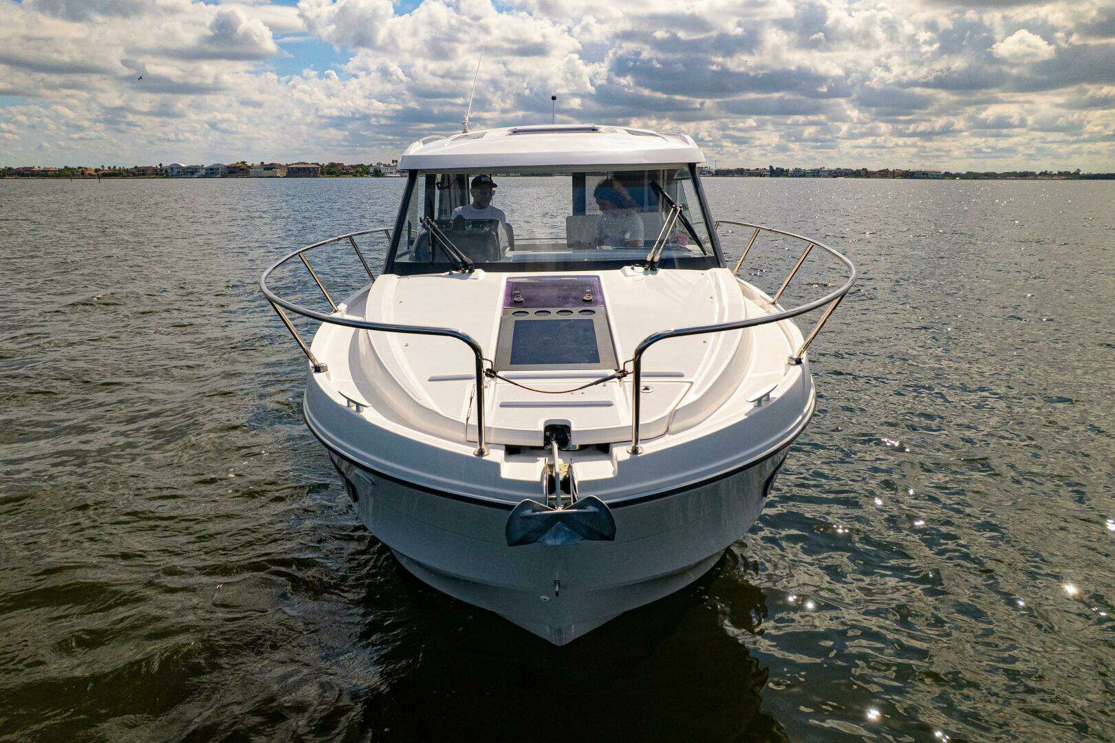 The cockpit features versatile seating that folds away to maximize deck space for fishing or lounging. Wide side decks and secure rails make moving around safe and easy, while the bow thruster simplifies docking. Whether you’re planning sunset cruises in Tampa Bay, weekend getaways to Sarasota, or fishing trips off Clearwater, this Antares 9 is the perfect platform.