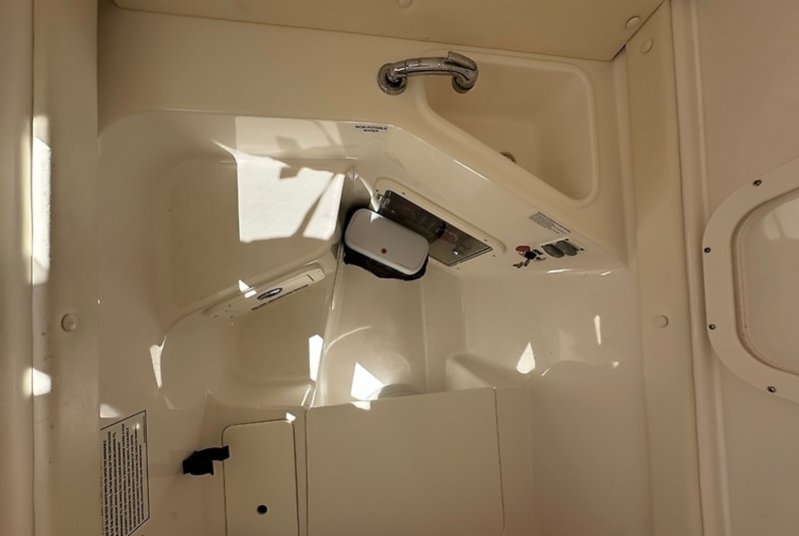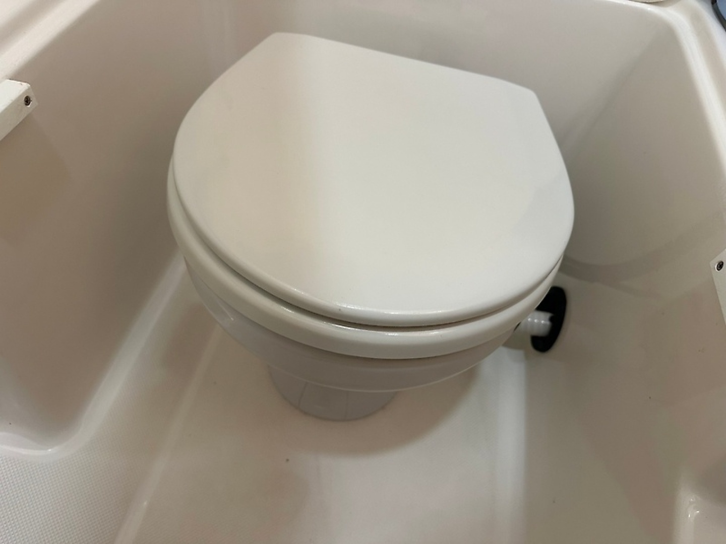 Full-height console cabin with electric toilet and porthole for comfort on longer days