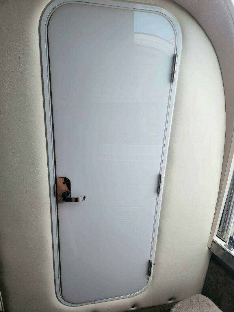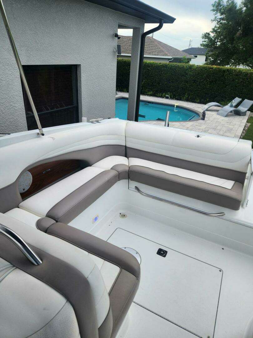 Accent blue lighting borders the perimeter and extended ladder for easy boarding.