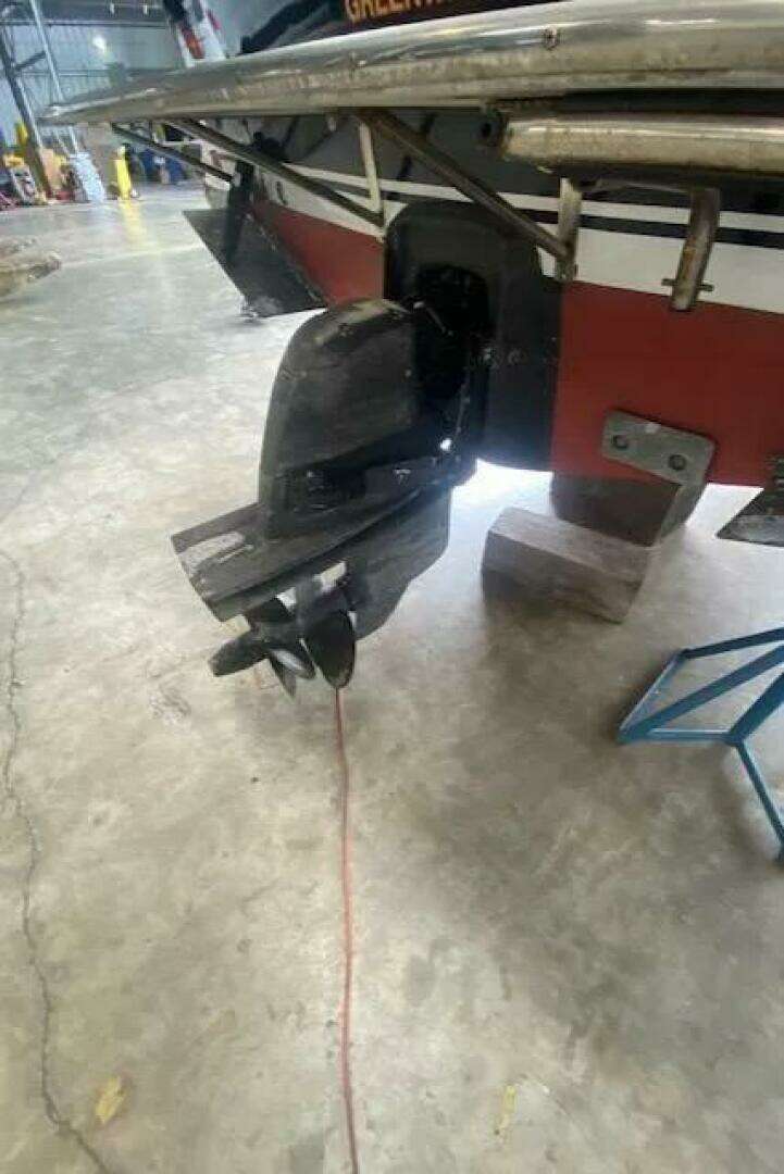 Self-bailing cockpit with L-settee with storage under, custom bolster back rest; doublewide Harrier style, twin thigh bolsters fore and aft adjustable, engine-box seat cushion with seat back.