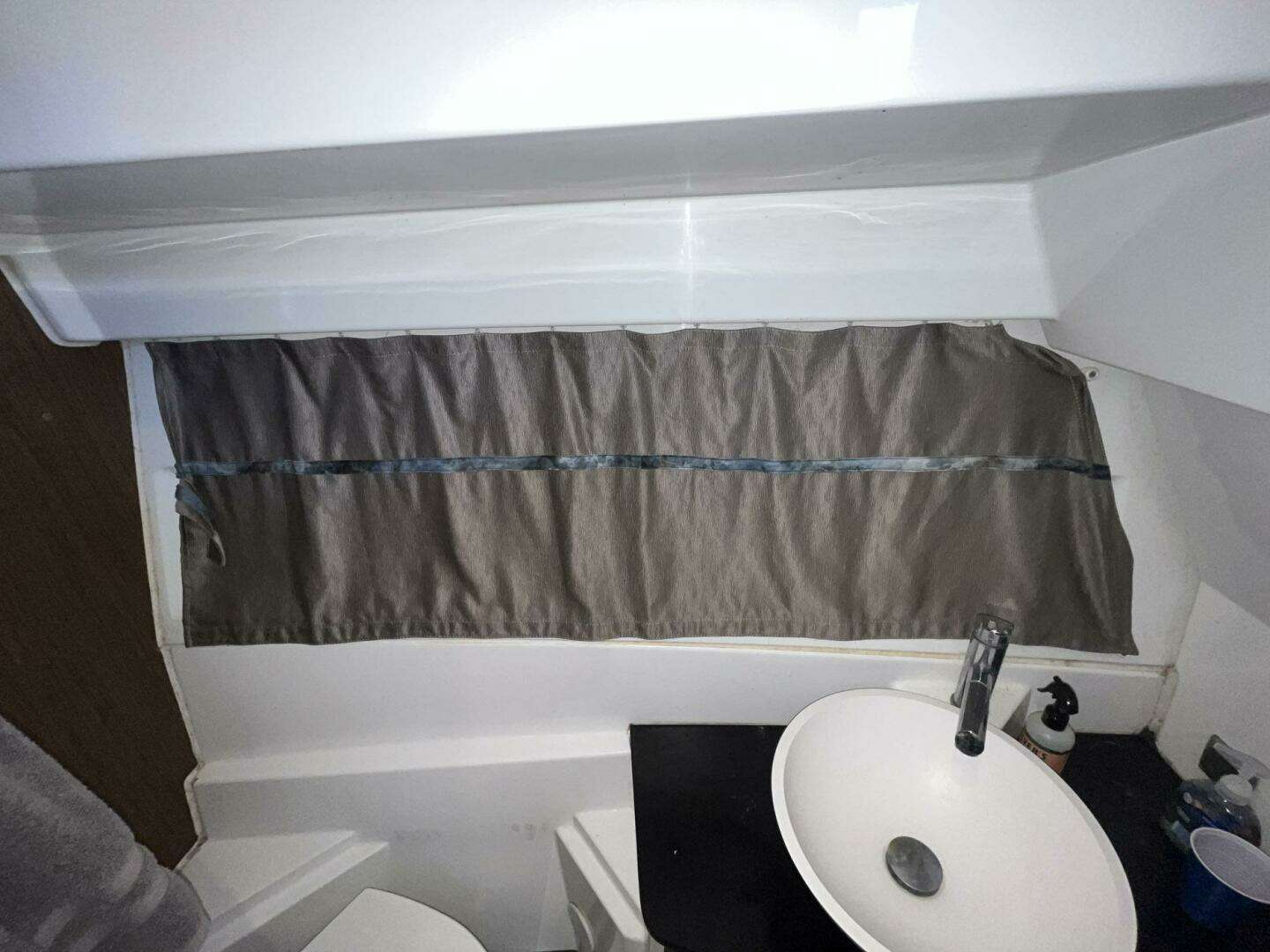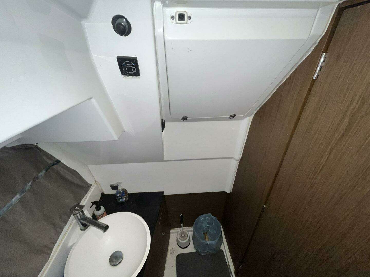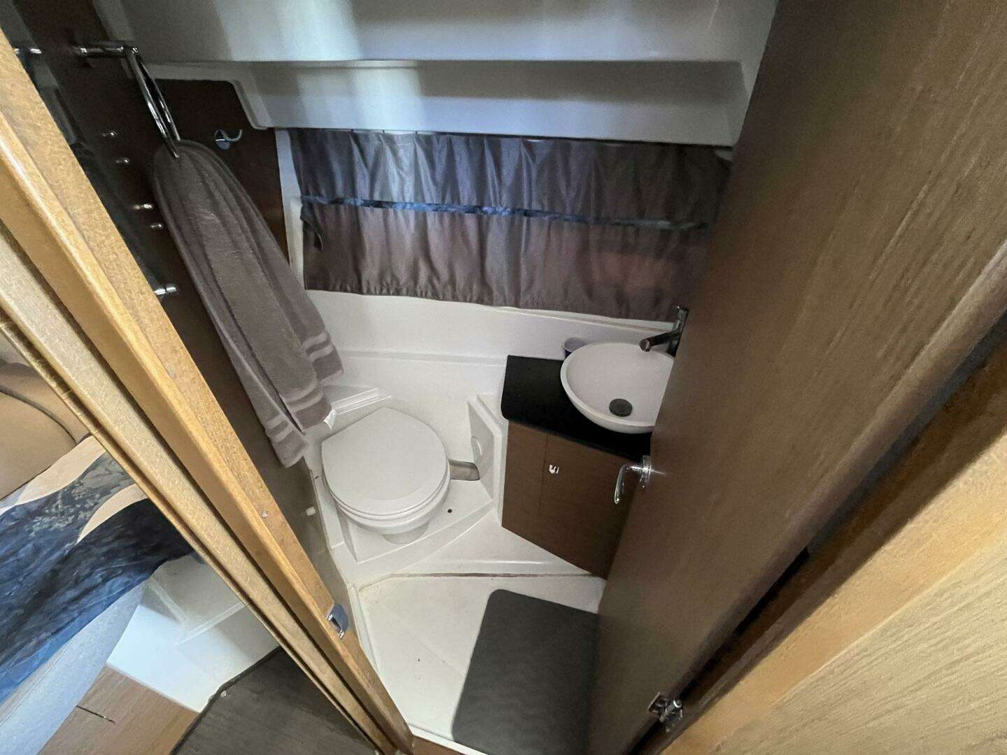 Aft of the master cabin, to starboard is the head. It features: an electric toilet (replaced by the current owner), a vessel sink, a vanity cabinet, and a hand-held shower faucet. An opening curtained porthole is available for ventilation. There is access to the back of the helm station in the head.