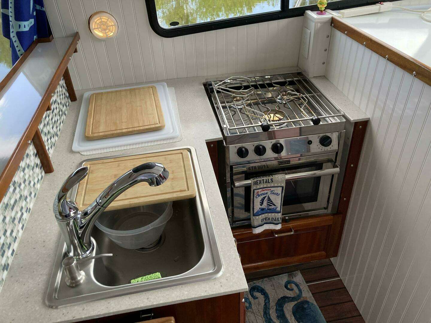 I can’t emphasize enough how this Prairie 29 has been expertly customized with upgrades including all new aluminum tanks, rebuilt/refinished forward berth with storage under, rebuilt custom galley, all new windows and bead board wall covering in salon and a head w/custom tile work and an electric Jabsco toilet. The cockpit is outfitted with a custom hard top, a robust tender davitt, Sundec on the sole and a transom wood appliqué. The owners recently cruised her down the intercostal from Virginia to explore SW Fl. and the Keys. Proud Mary is their floating home away from home and is turn key.