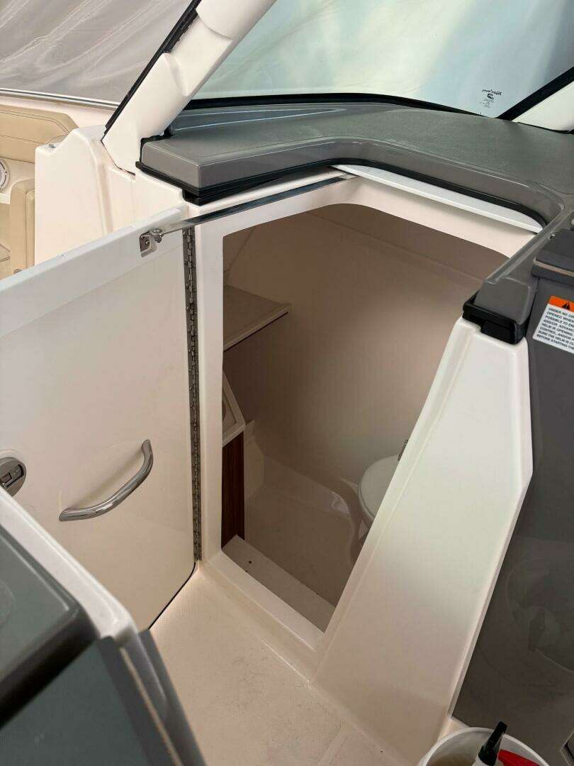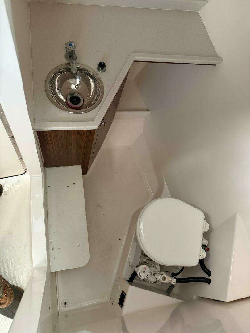 To starboard is the enclosed head compartment with electric toilet, sink and Corian counter.