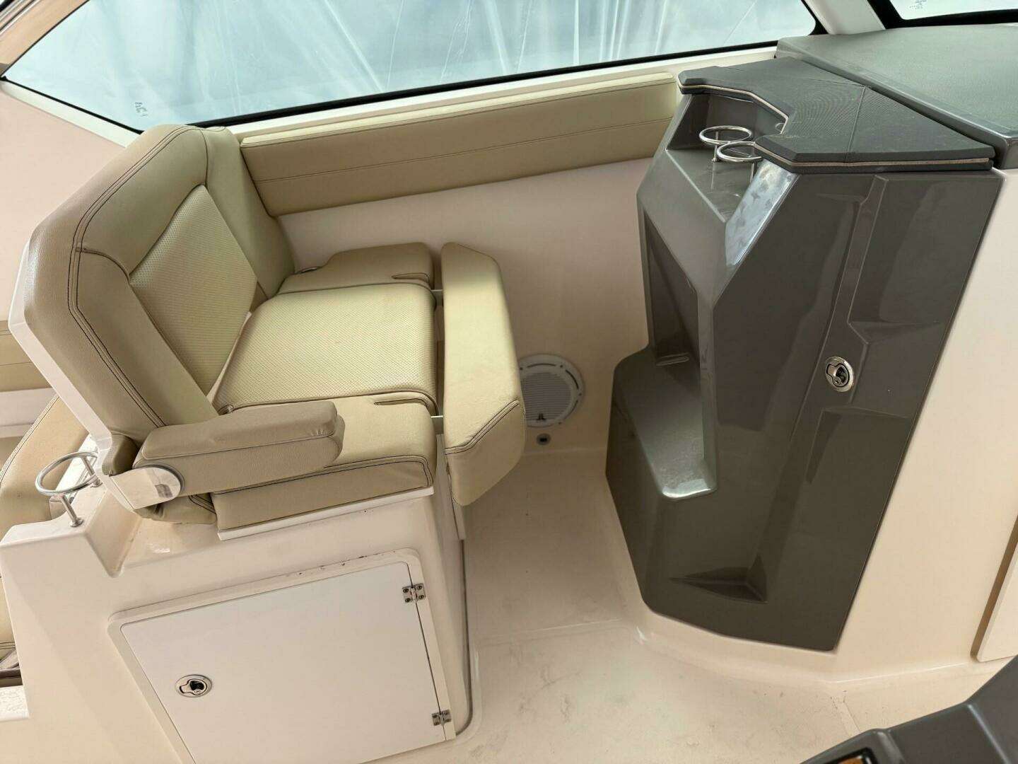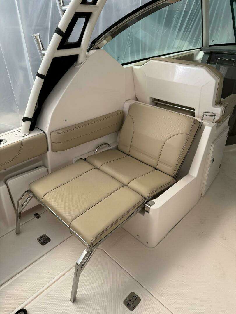 Opposite of the starboard helm seat is a double wide companion seat to port.