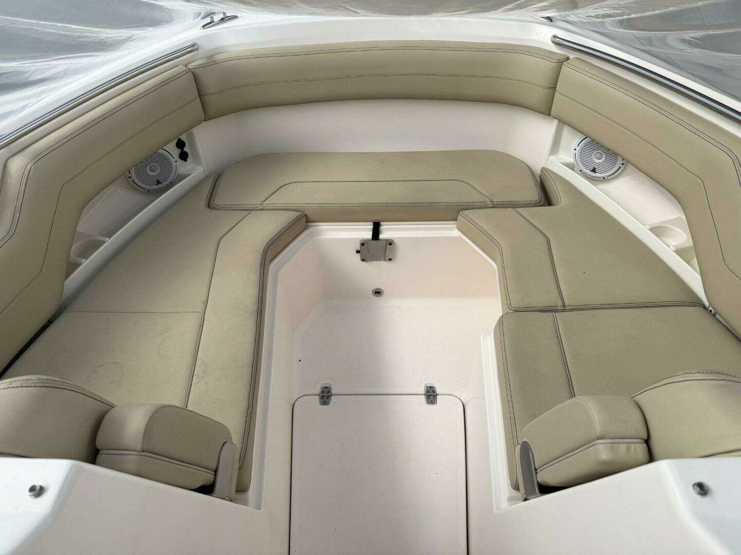 At the bow are facing lounge seats connected to a U-shape settee.