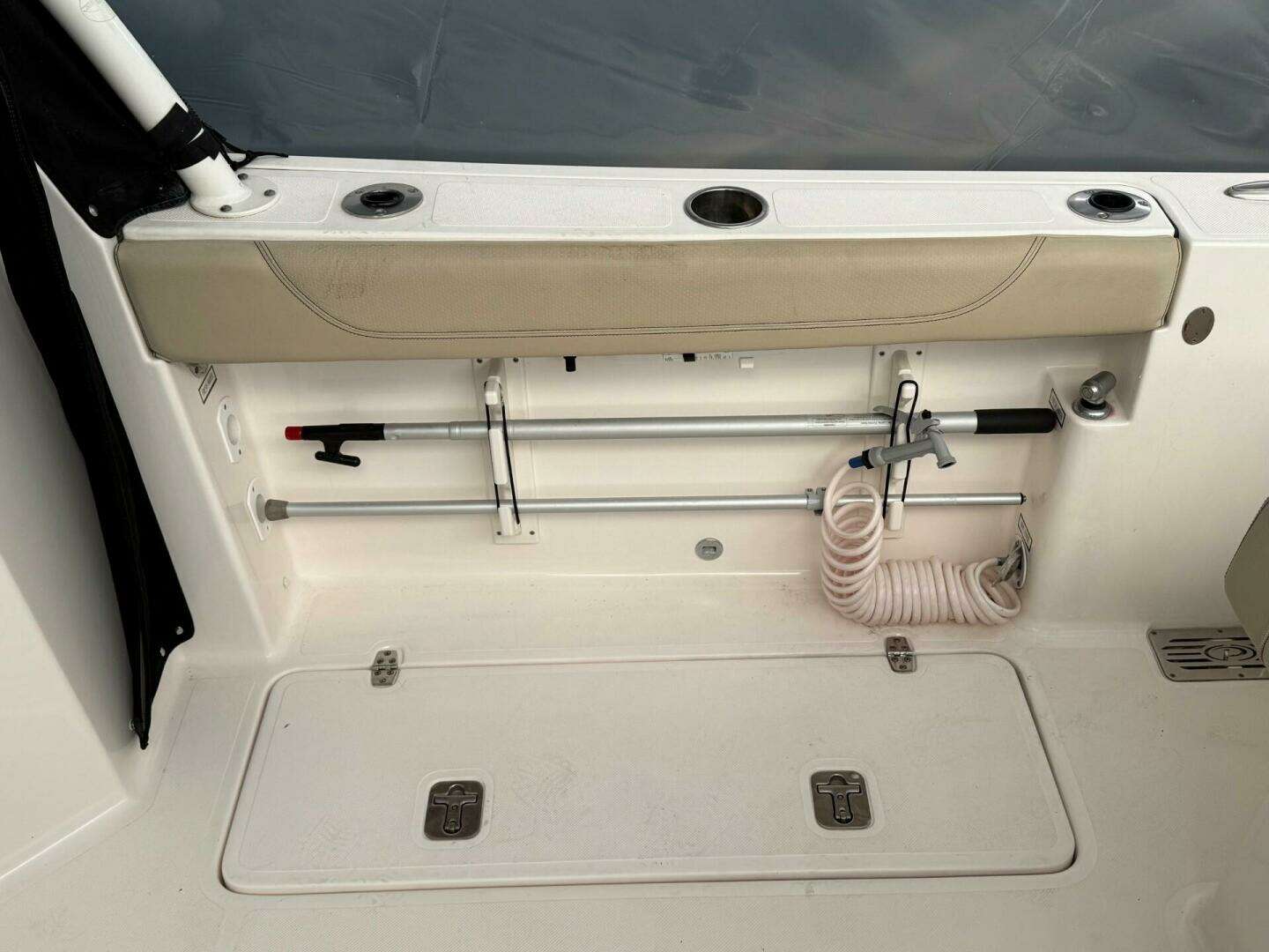 The port side console contains a huge gear storage area with rod holders
