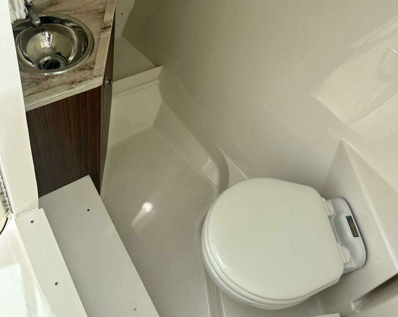 - Molded fiberglass head compartment with Corian® countertop, vanity, electric marine toilet, 10-Gallon holding tank, and macerator discharge