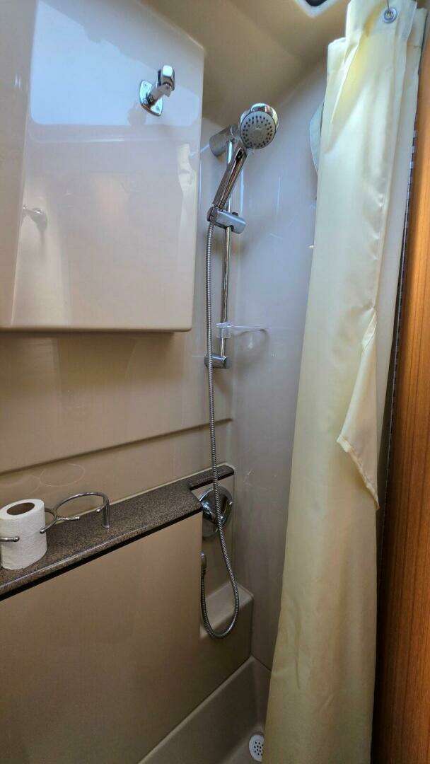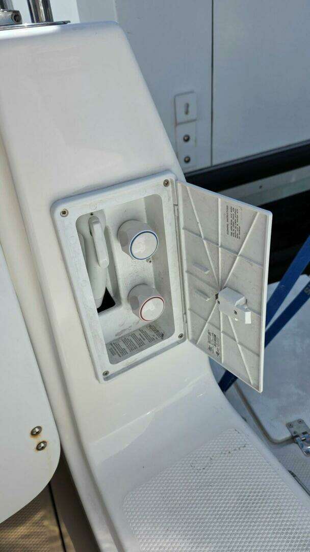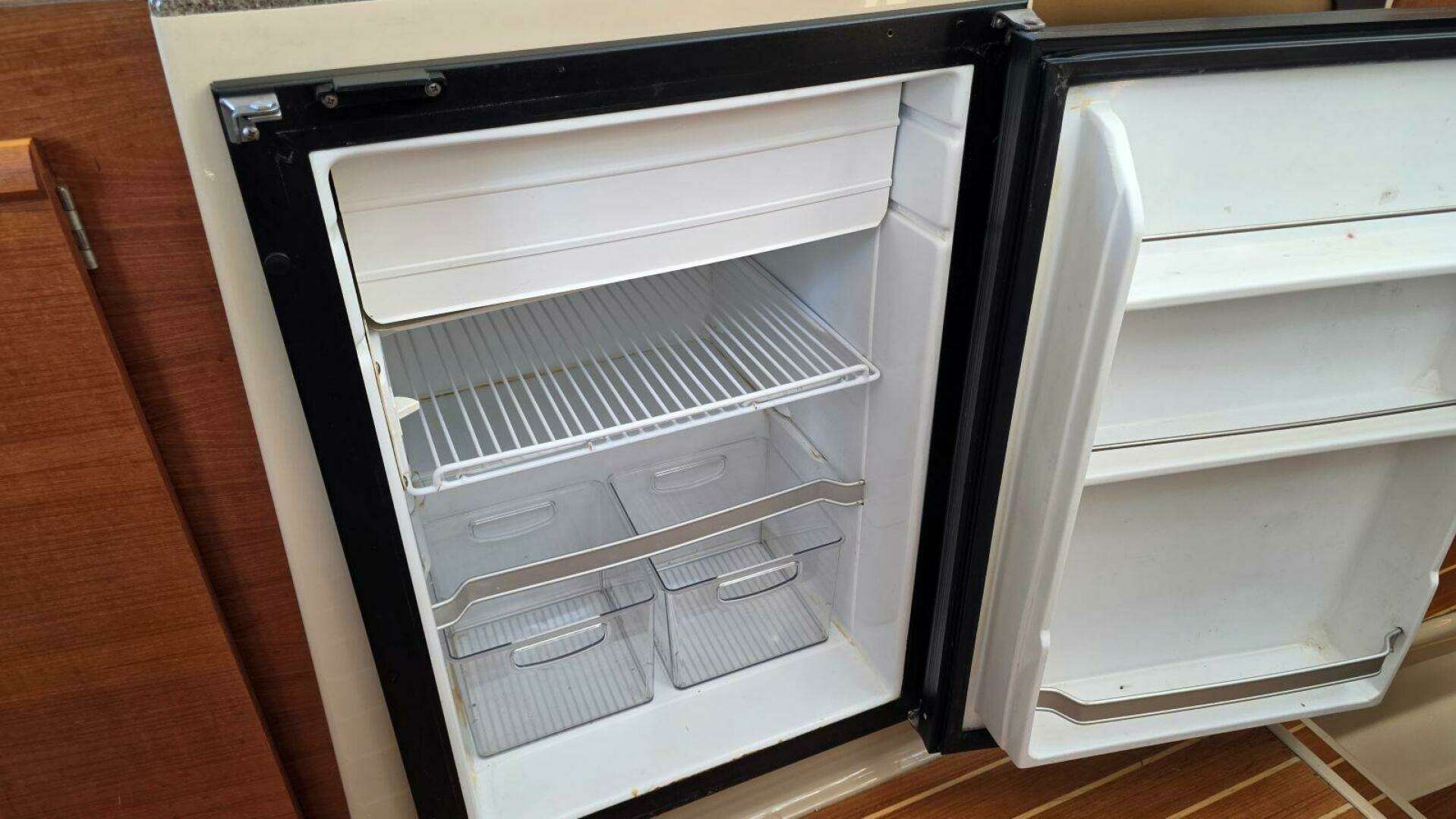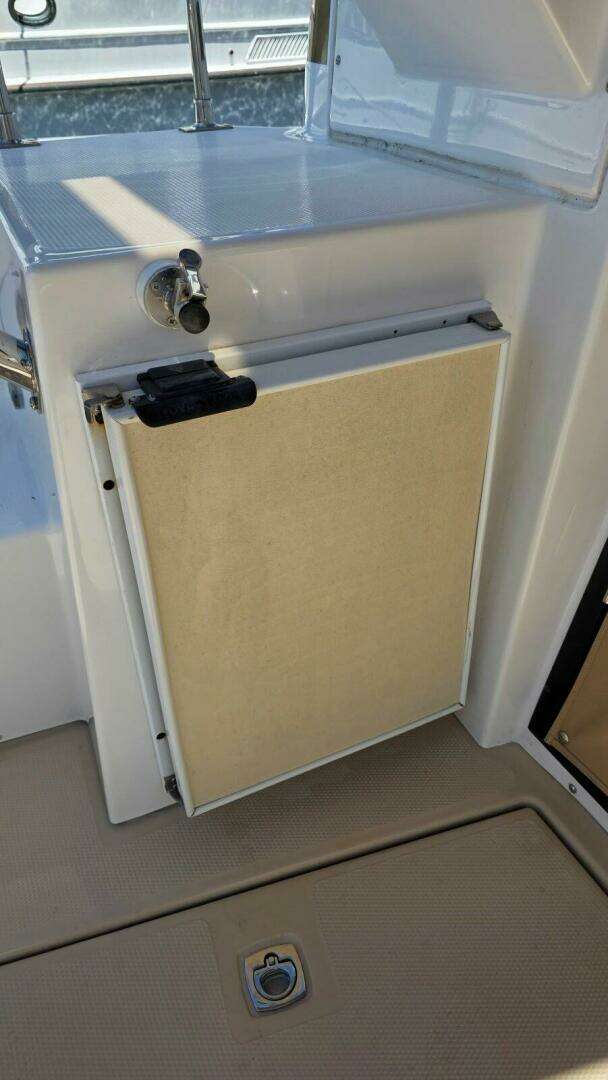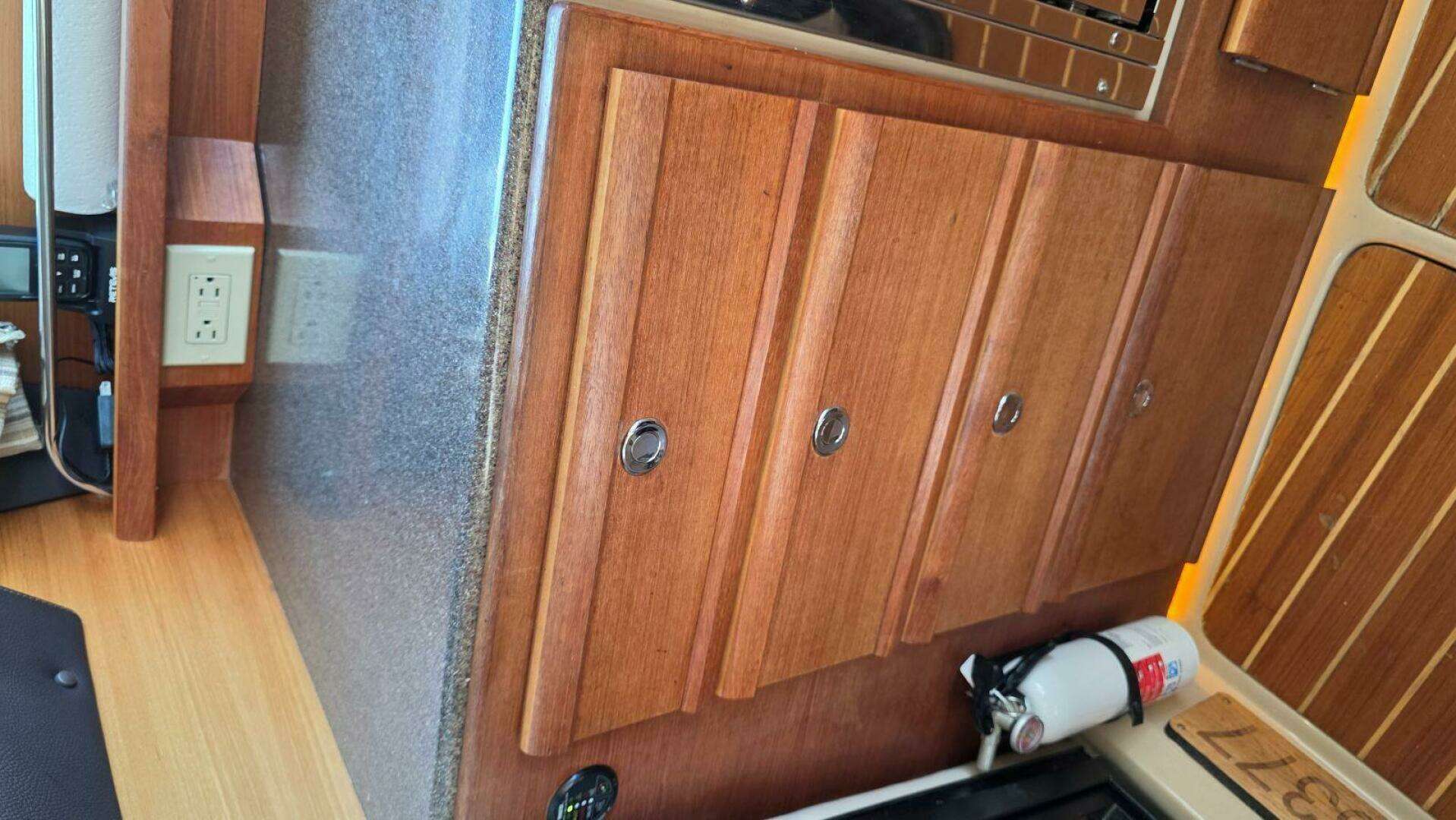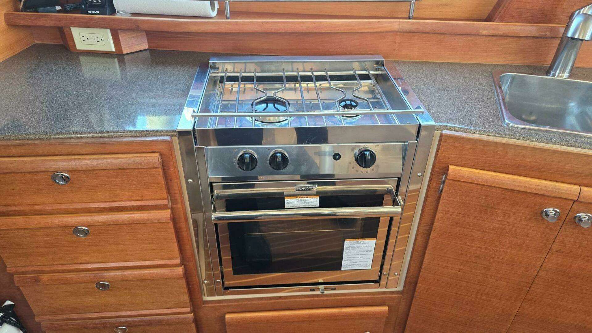 Cooking aboard is supported by a gas cooktop along with a gas oven, providing true meal preparation capability rarely found in boats of this size. The thoughtful layout makes the galley comfortable and practical whether preparing quick meals underway or cooking while anchored out for the evening.