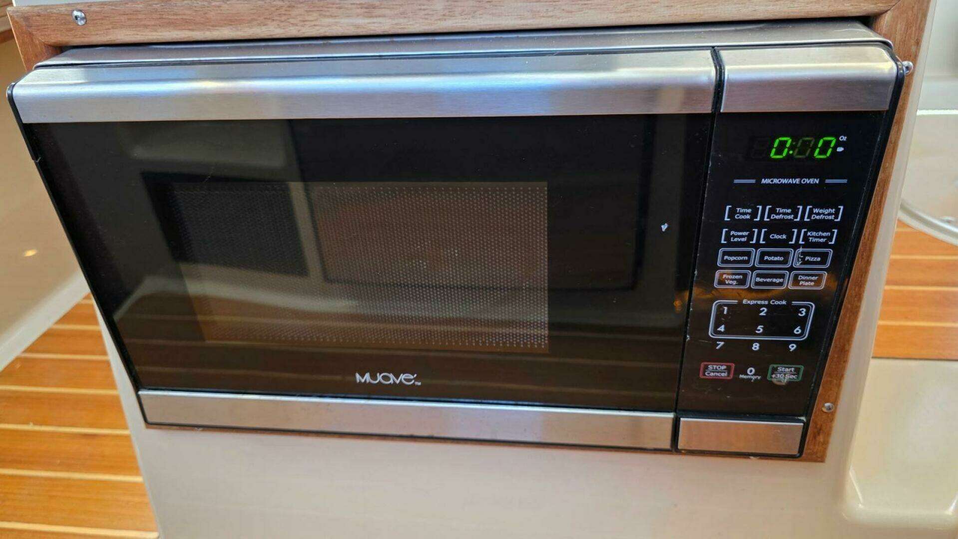 The galley is well equipped for extended cruising and features generous counter space, a stainless steel sink, refrigerator/freezer, microwave, and ample cabinetry for storing cookware and provisions.