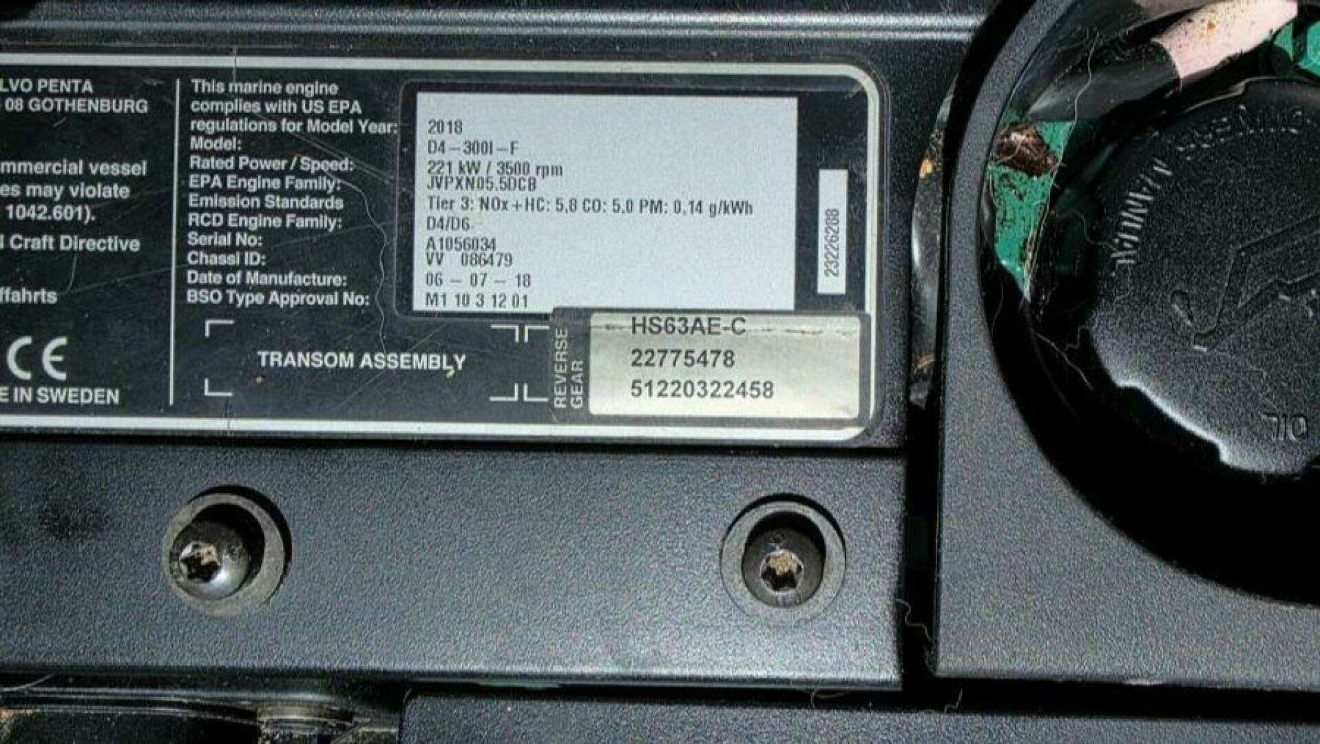 Dizzy Alice is powered by a Volvo D4 diesel engine producing approximately 300 horsepower and showing less than 800 hours. The engine provides dependable performance and excellent fuel efficiency for cruising.
