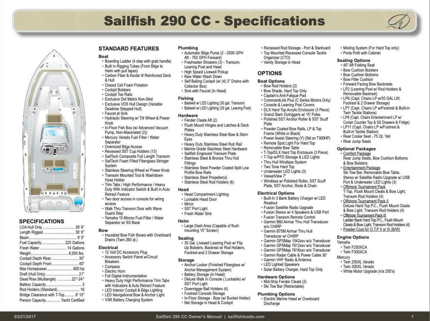 The 2017 Sailfish 290 CC is a versatile, offshore-capable center console known for its soft, dry ride thanks to the Variable Degree Stepped (VDS) hull, blending serious fishing features like twin livewells, extensive rod storage, and dual fish boxes with family-friendly comfort for cruising and watersports. Key specs include a 28'6" LOA, 9' beam, 225-gallon fuel capacity, and robust construction with Carbon Fiber & Kevlar reinforcement, making it a "triple threat" for fishing, family fun, and sunset cruises, with large dash space for electronics.