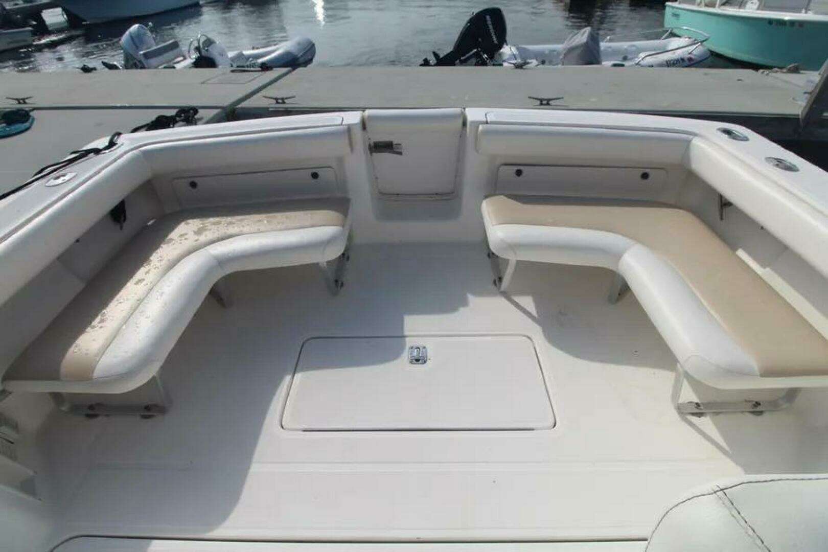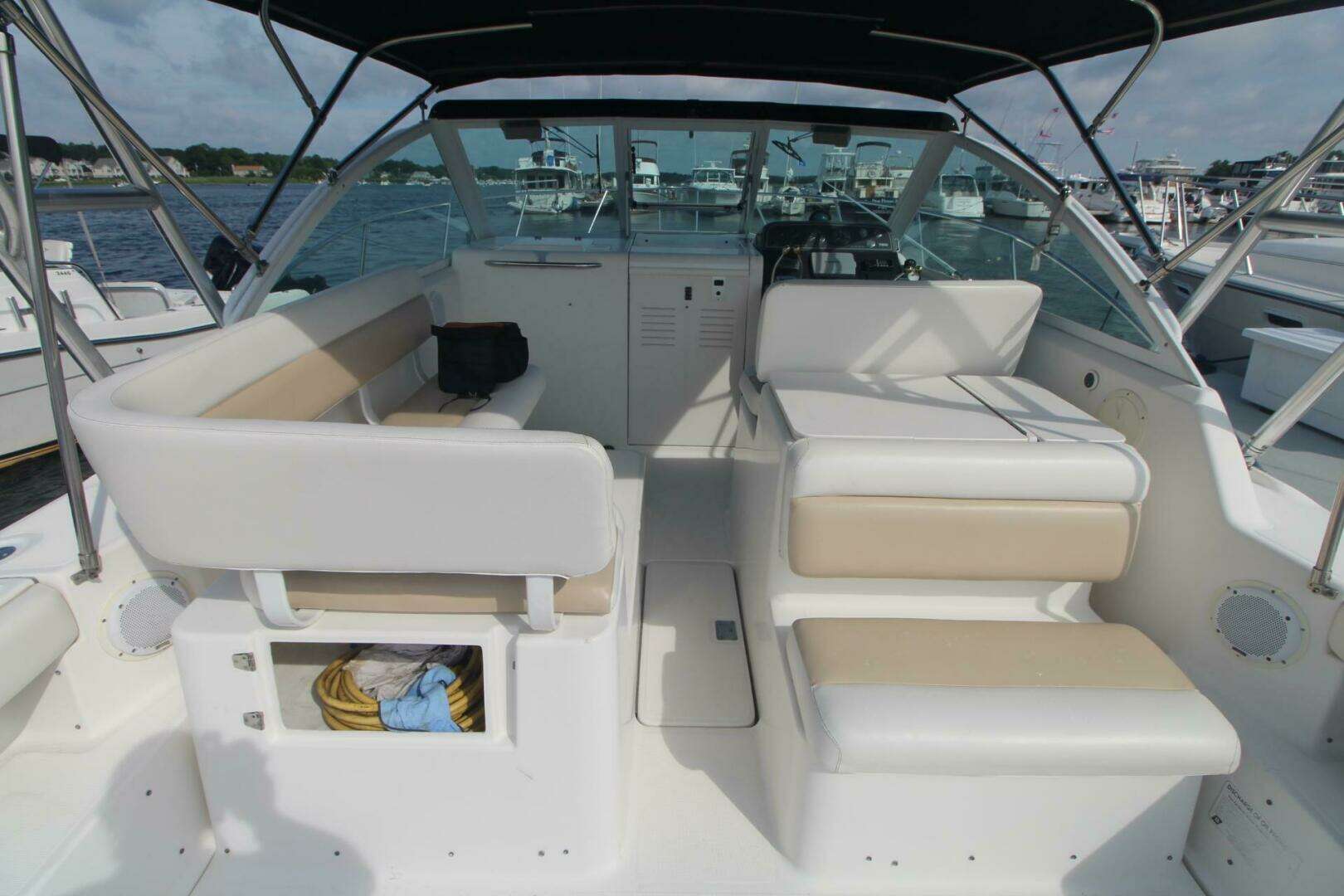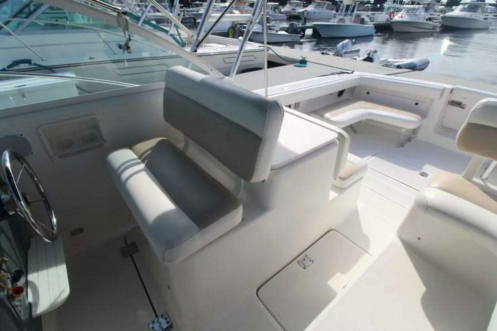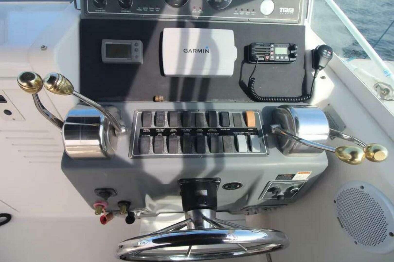 Additional DescriptionTiara’s custom diamond pattern non-skid is used on all deck and cockpit surfaces. The windshield is custom welded aluminum with Solex 1/4" tempered safety glass, and has a center hinged ventilating section with adjuster, and curved side windows with handrails. There is one aluminum forward deck hatch with adjuster and screen. To starboard sits the “Heads Up” fiberglass tilt-away helm station with full flush mount electronics capability. A fiberglass navigation chart area with handrail, drink holders, and storage sits to port. The reverse-curved transom with molded-in centerline cockpit entry and transom door is a great look and is complemented by a molded-in fiberglass swim platform complete with built in, recessed, folding swim ladder. There is a one-piece 316L S.S. bow rail and molded-in pulpit which can be outfitted for roller assembly and windlass.