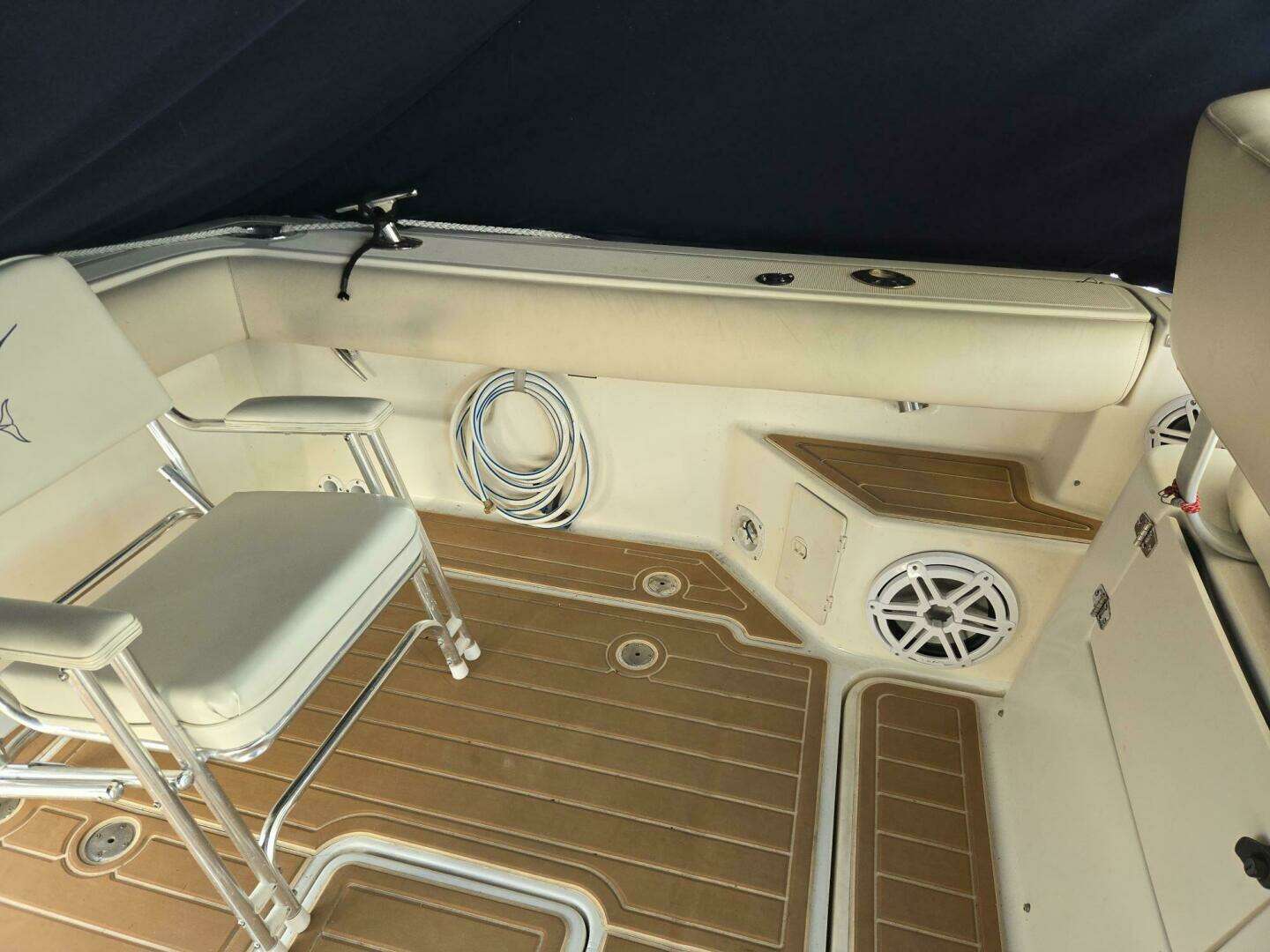 Forward you have a V-Berth with storage underneath, hanging locker and a ventilation hatch. Aft to starboard is the galley area with nice amenities. Aft to port is the enclosed head. Up a couple of steps to the helm deck with the helm to starboard and a L- Shaped lounge seat to port. Sea Deck on Helm deck, cockpit and swim platform. Behind the helm seat you have a wet bar with sink followed by an aft facing bench seat. Out the transom door to the extended swim platform.