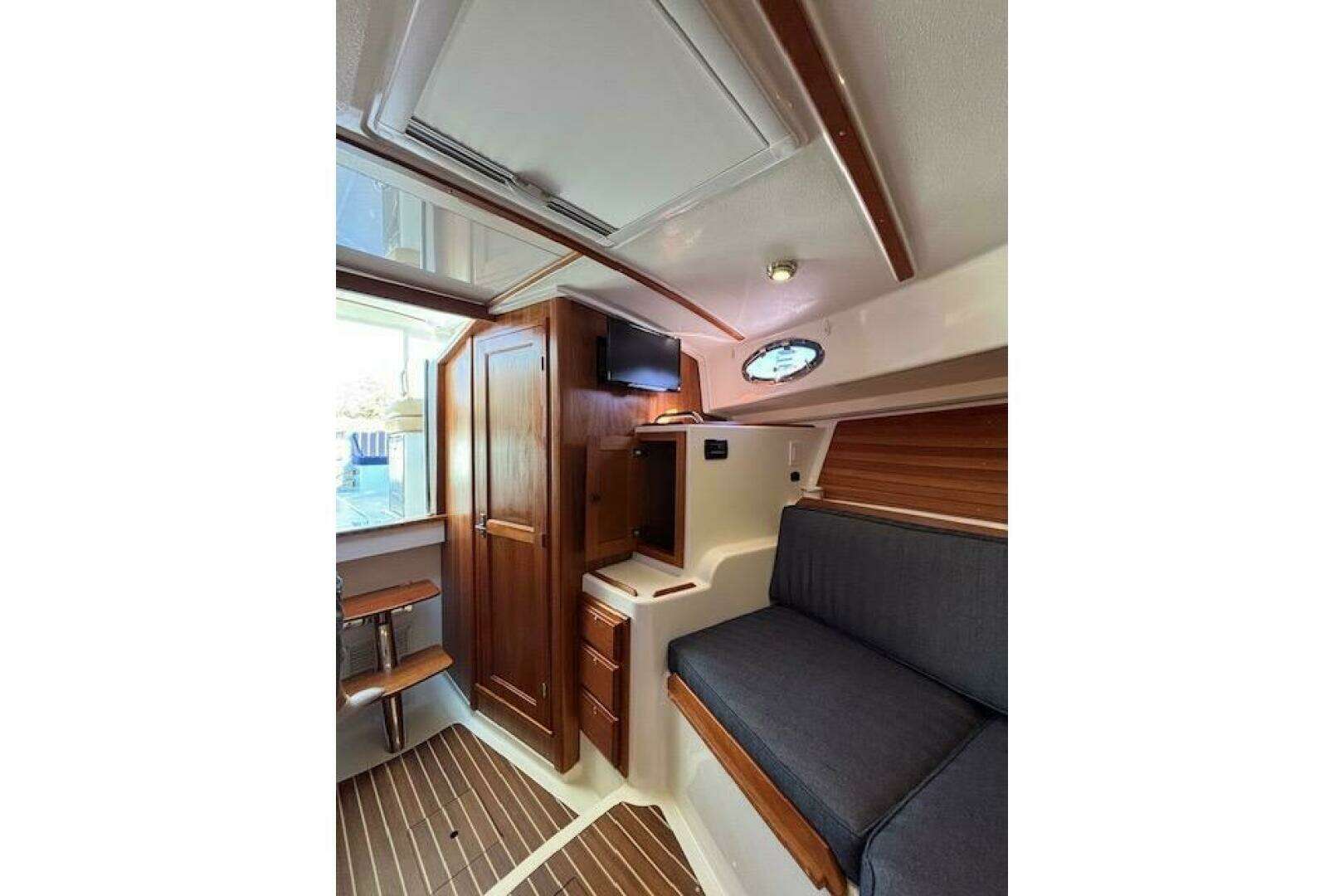 - Varnished Cherry interior joinery on molded composite liner