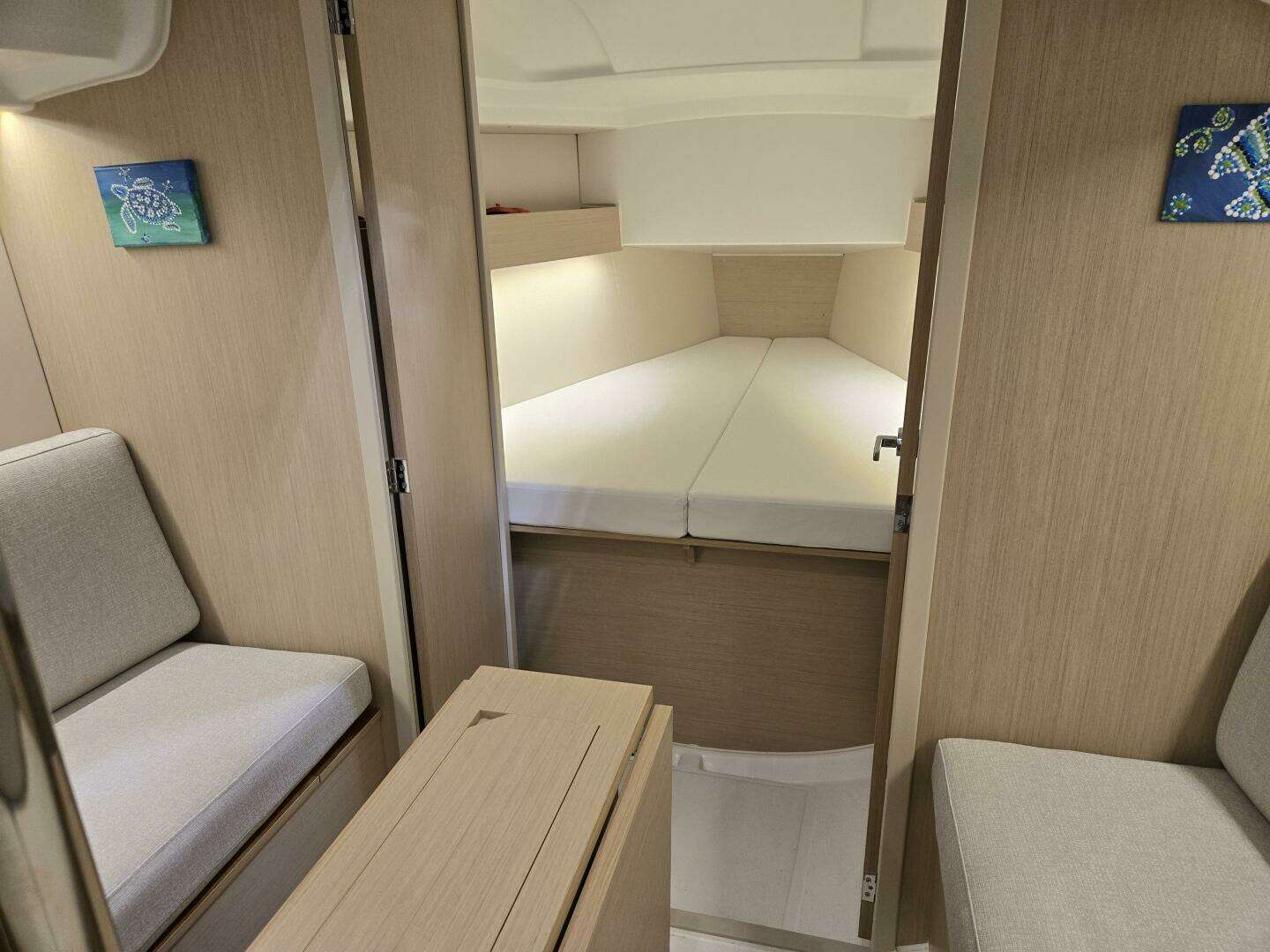 The Oceanis 30.1 is easy to sail but lively to helm and promises new experiences and thrills. This robust smart cruiser is small enough to sail alone and big enough to coastal cruise with friends. The interior features a large vee berth forward with storage under and lockers and shelves to port and starboard. There is a hatch overhead with shade and screen built-in. Double doors close for complete privacy but open to make the interior feel more spacious for a view to the bow from the companionway.