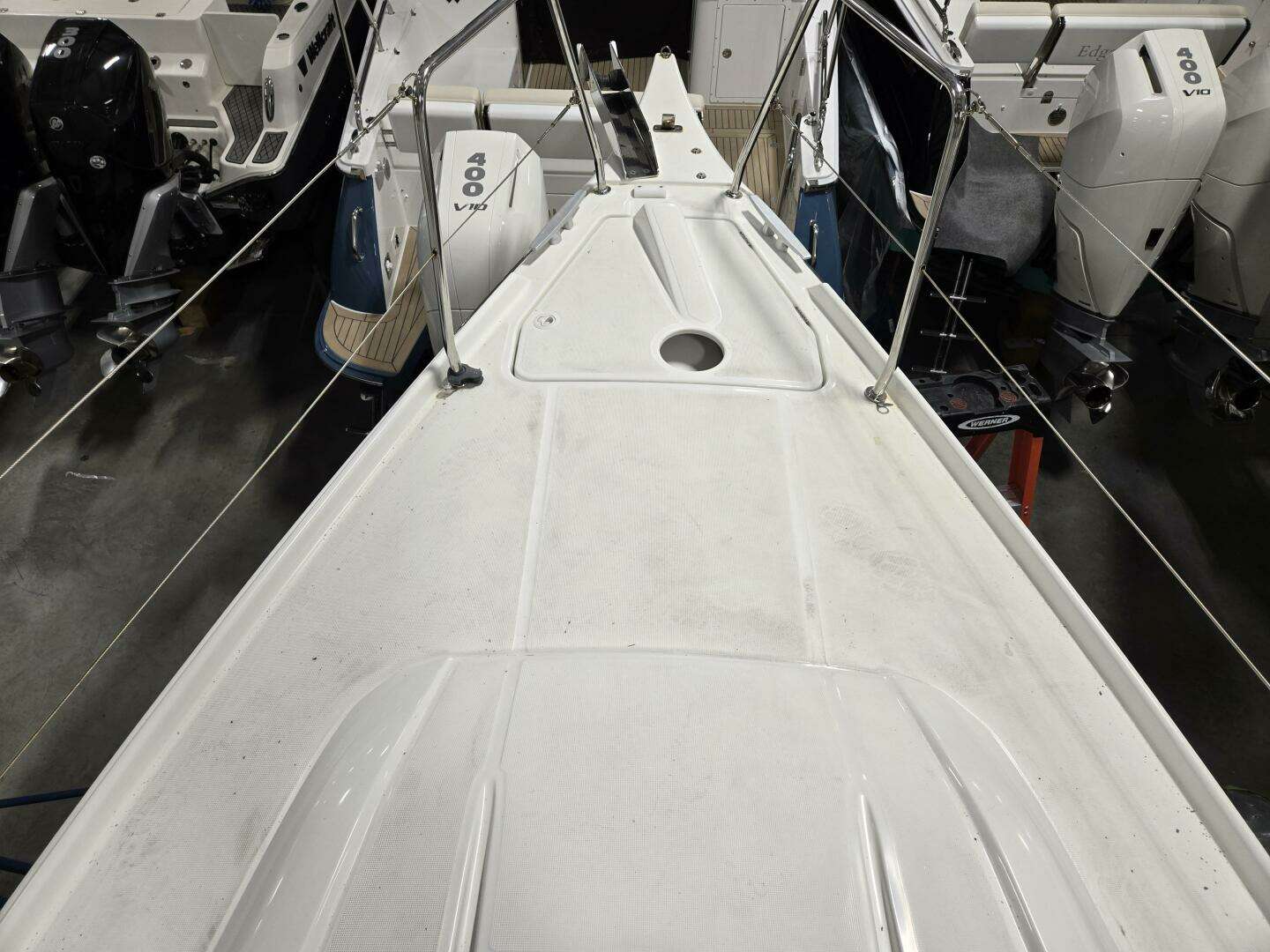 MOORING LINES - MOORING • Self-draining chain locker - Clench bolt - Hatch cover • Single roller stainless steel bow fitting with offset roller • 6 Aluminum mooring cleats - Stainless steel chafing plate