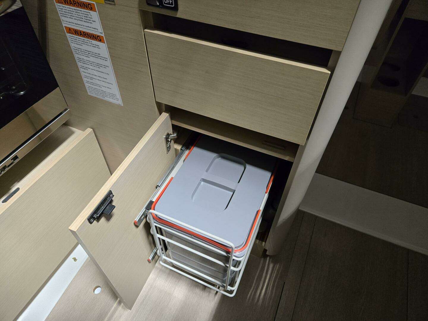 GALLEY - PORT Headroom: 1,85m / 6’1’’ • L-shaped galley • Worktop in compact Clay with painted wooden fiddles • 1 1 rectangular stainless steel sink (350mm x 320mm / 1’2’’ x 1’1’’) • 1 Mixer tap with hot/cold water under pressure • 1 Gas cooker 2 burners - Stainless steel oven on gimbal - Stainless steel protection handrail • Stowage on work top with top opening (75L / 20 US Gal) • Cupboard - Storage and lockers • 1 Double dustbin: 2 x 15L / 4 US Gal • 1 12 V socket • 2 LED ceiling lights • 1 Opening portlight with curtains in the coachroof side window