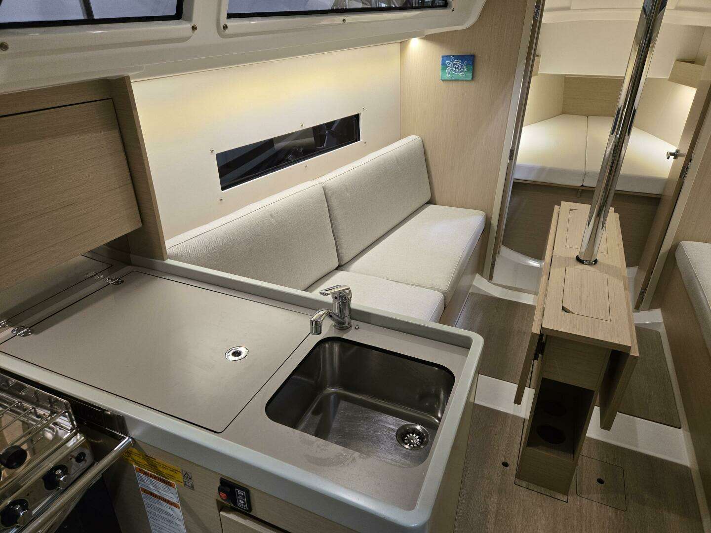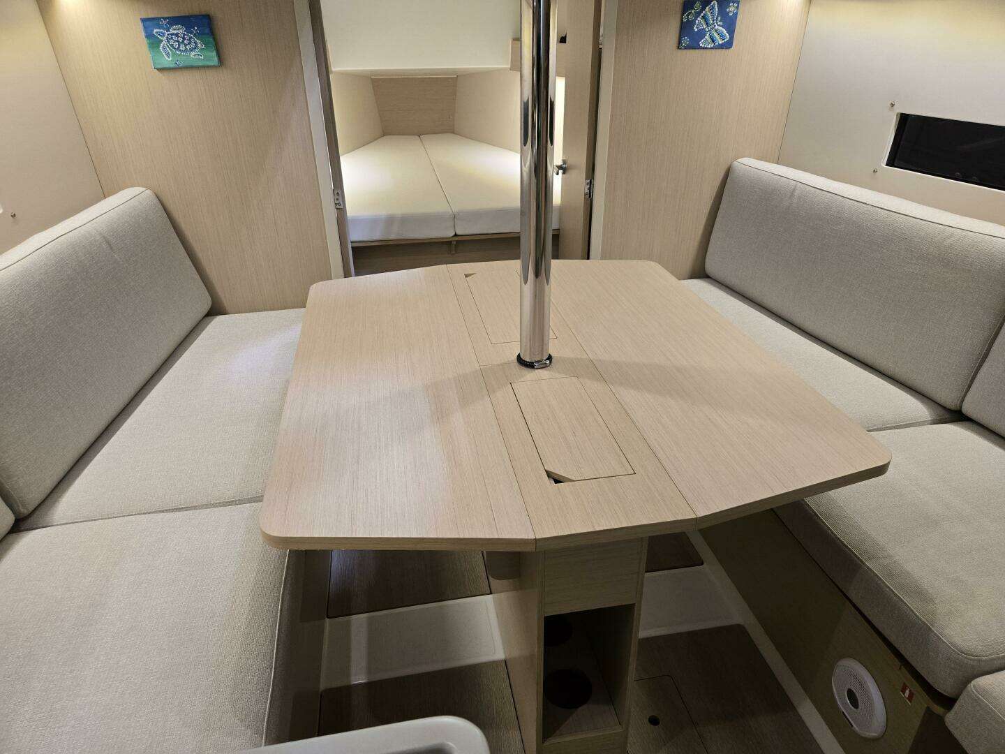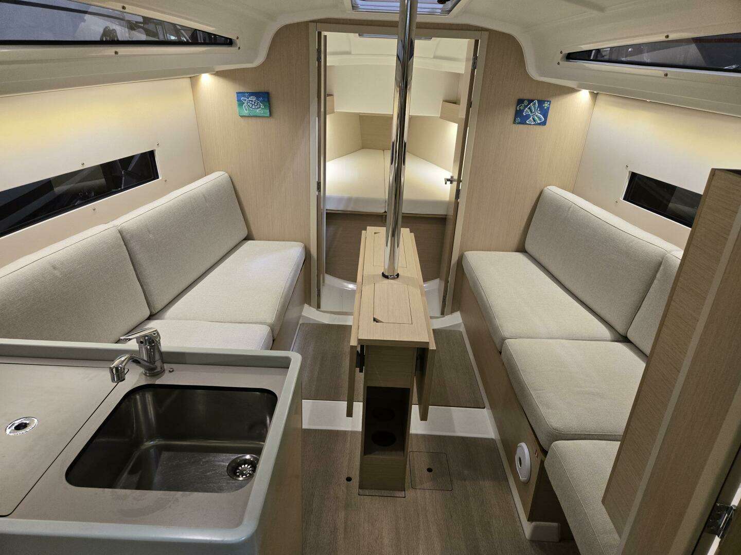 Aft are straight settees to port and stbd. On stbd, there is a filler cushion which when removed provides leg room for the fold-down chart table option at the navigation station. A large table is on centerline with two leaves which fold out to sit six for dinner. Windows in the hull provide a view out when sitting and also long windows are mounted in the deck house. There is a hatch overhead with shade and screen built-in.