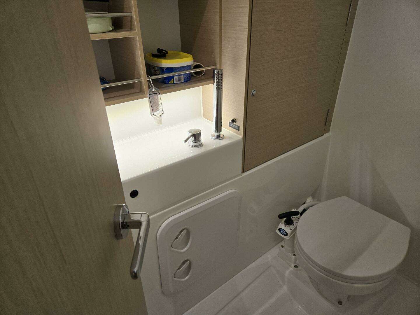 The private guest cabin is aft to port and features a large double bed with ports for light and air. Aft to stbd is a large head with marine toilet, sink vanity, shower and curtain to keep the balance of the head dry.