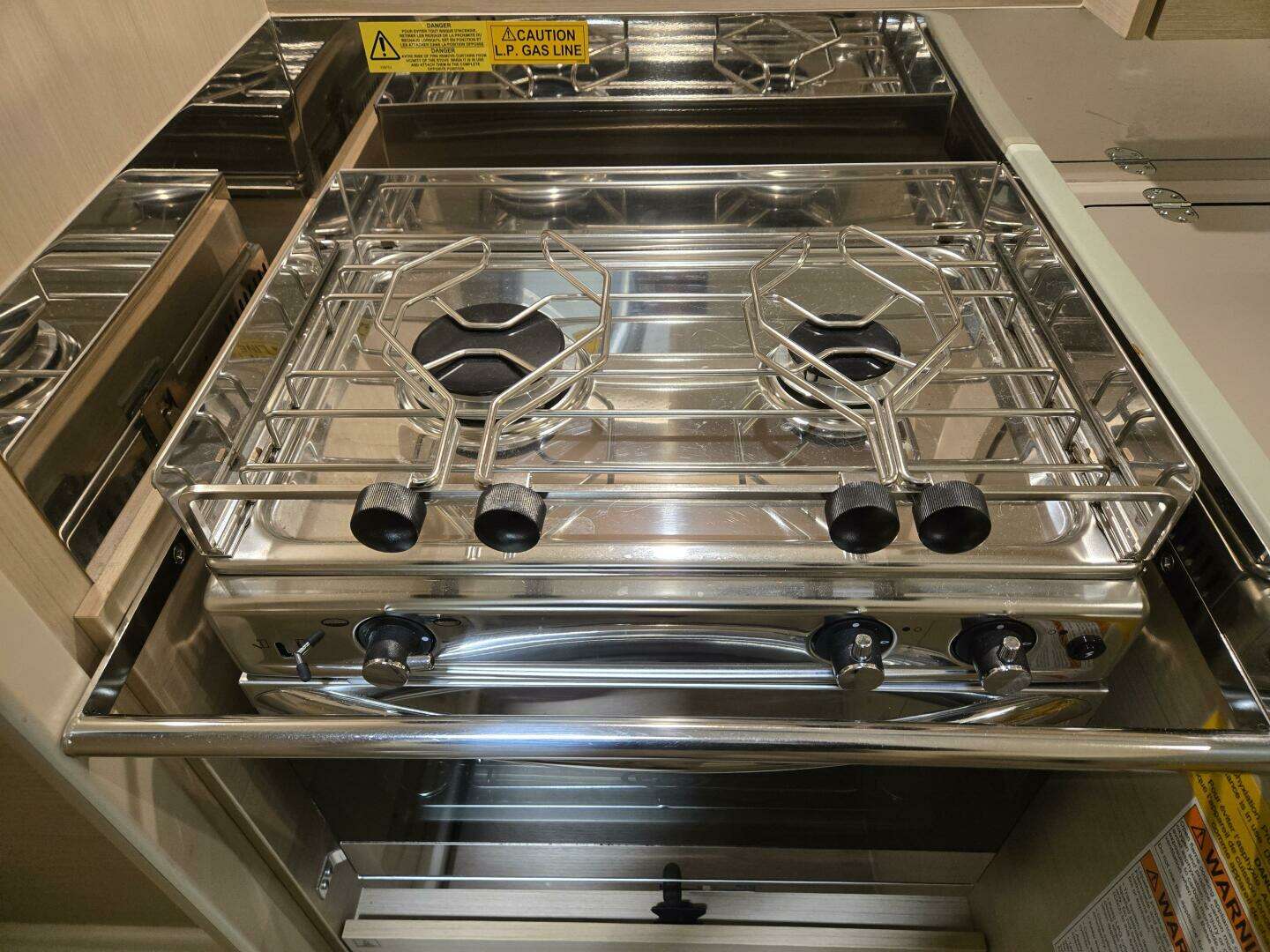 - Stainless steel two burner propane stove and oven with gimbal (never used)