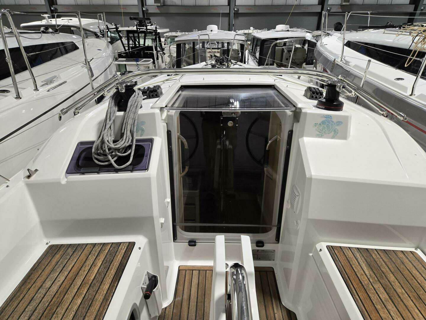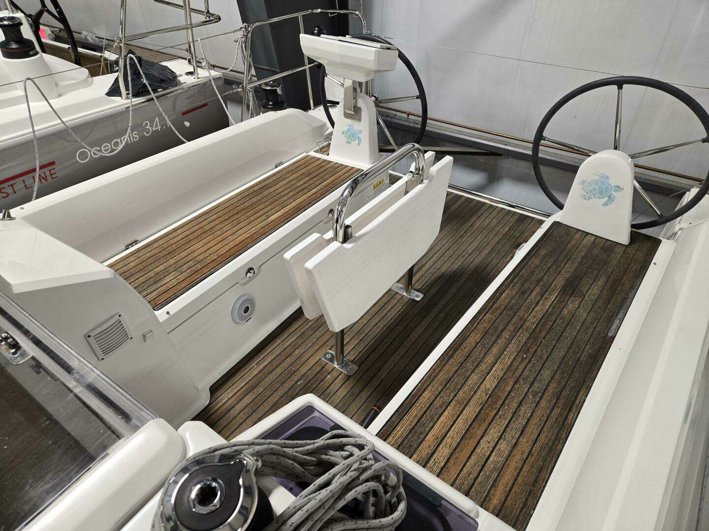 - Slatted marine hardwood on cockpit sole