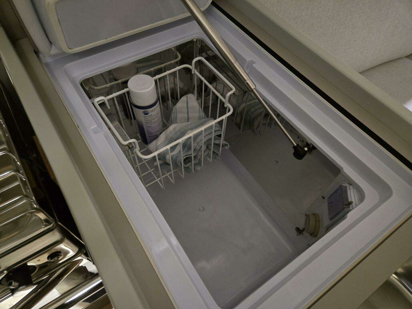 An L-shaped galley is to port with a stainless steel sink, large refrigerated top-load ice box, two burner stainless steel propane stove with oven that gimbals that does look like it was ever used. There is ample storage and a pull out waste bin. An opening portlight is fitted into the deck house window.