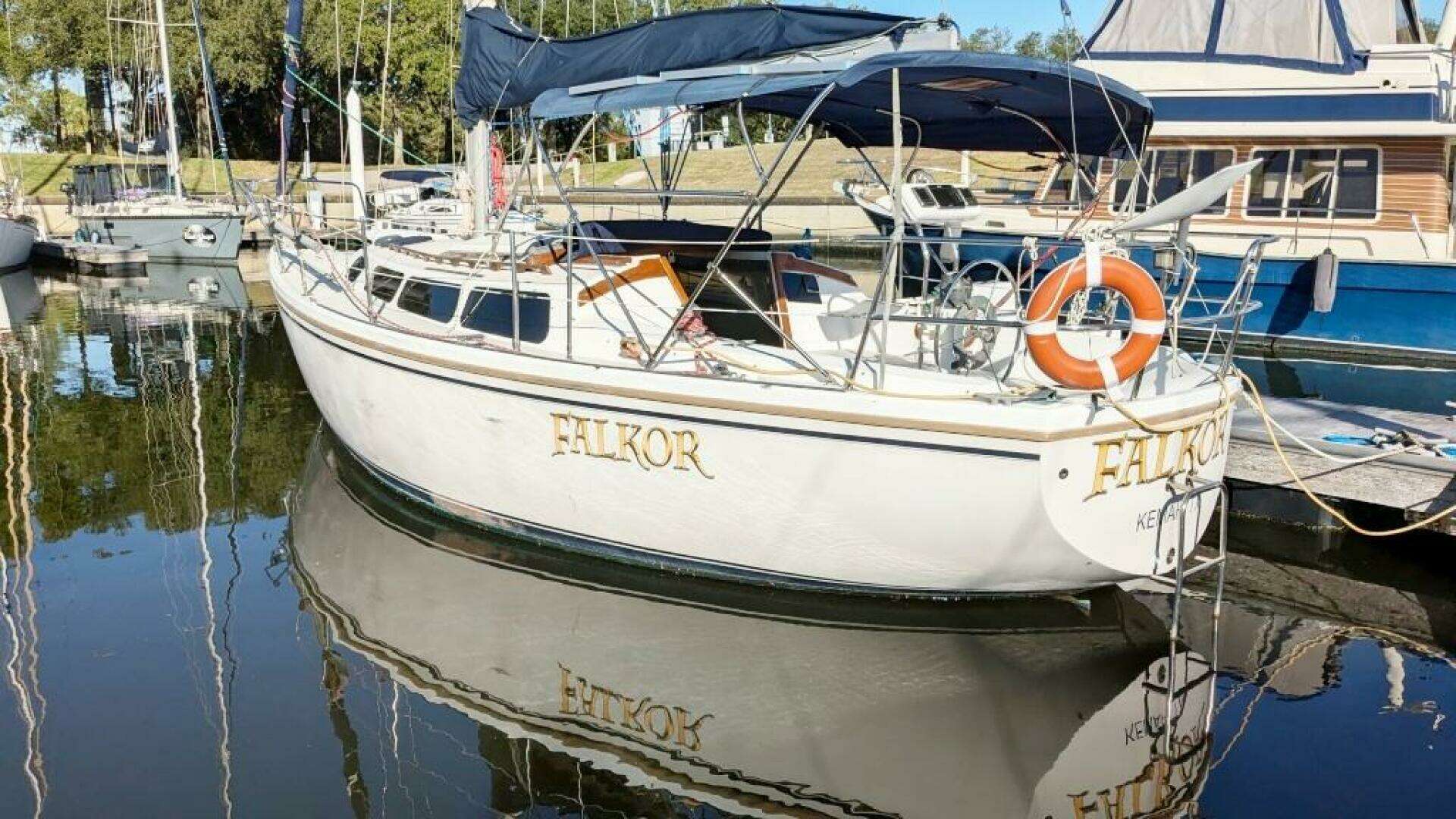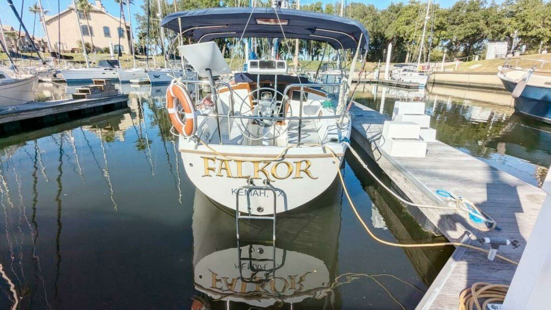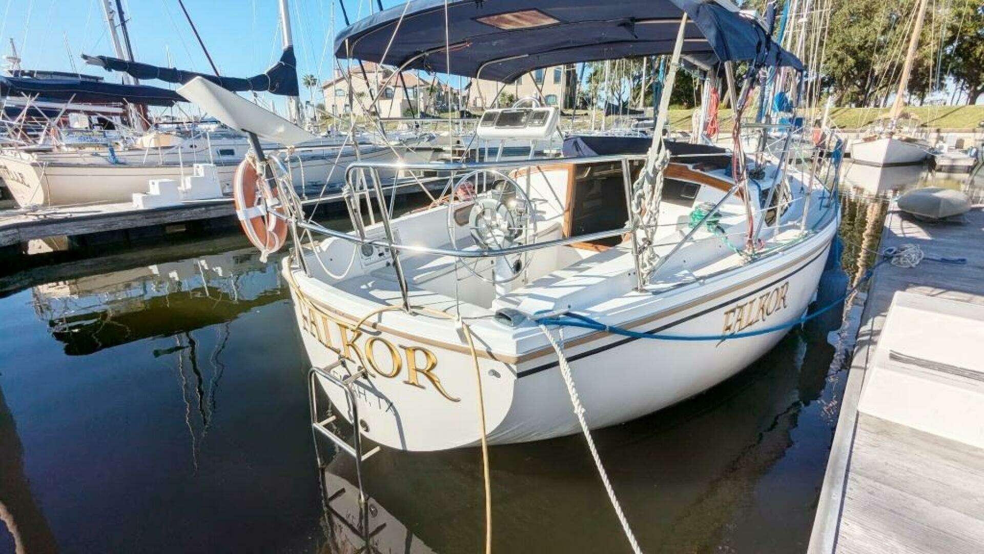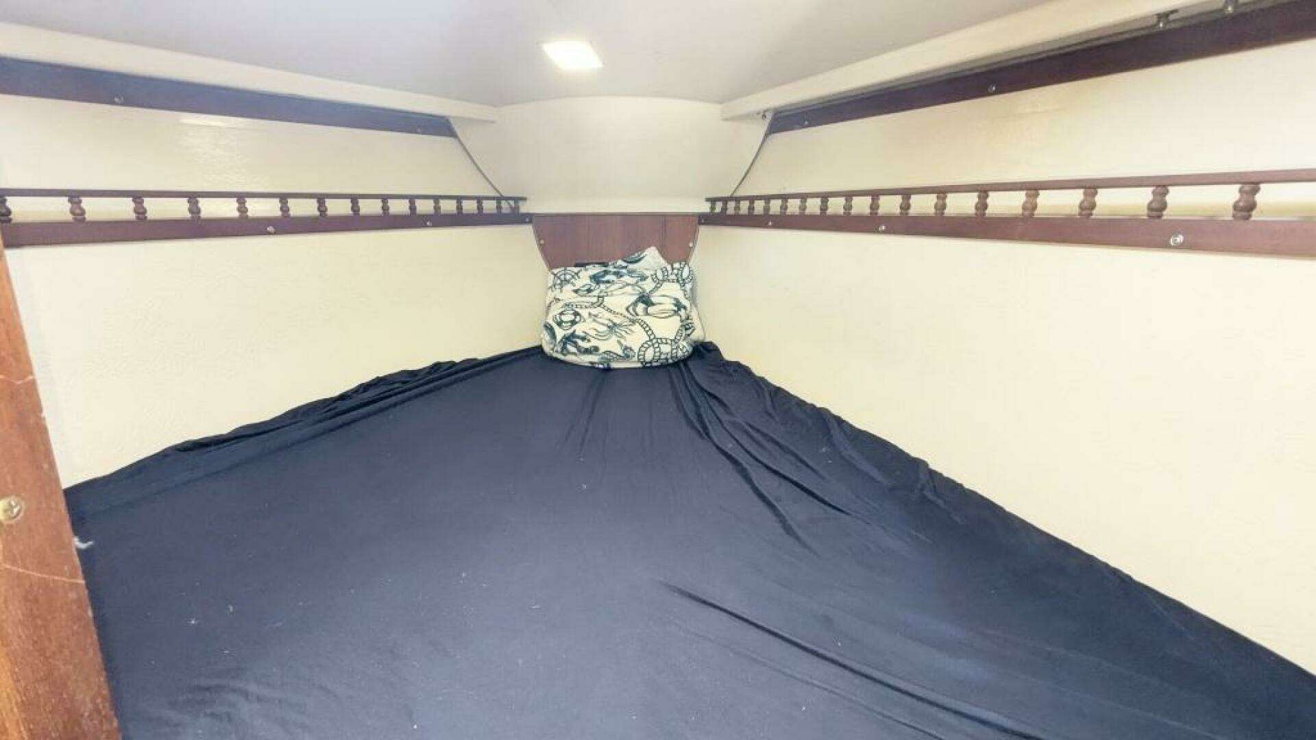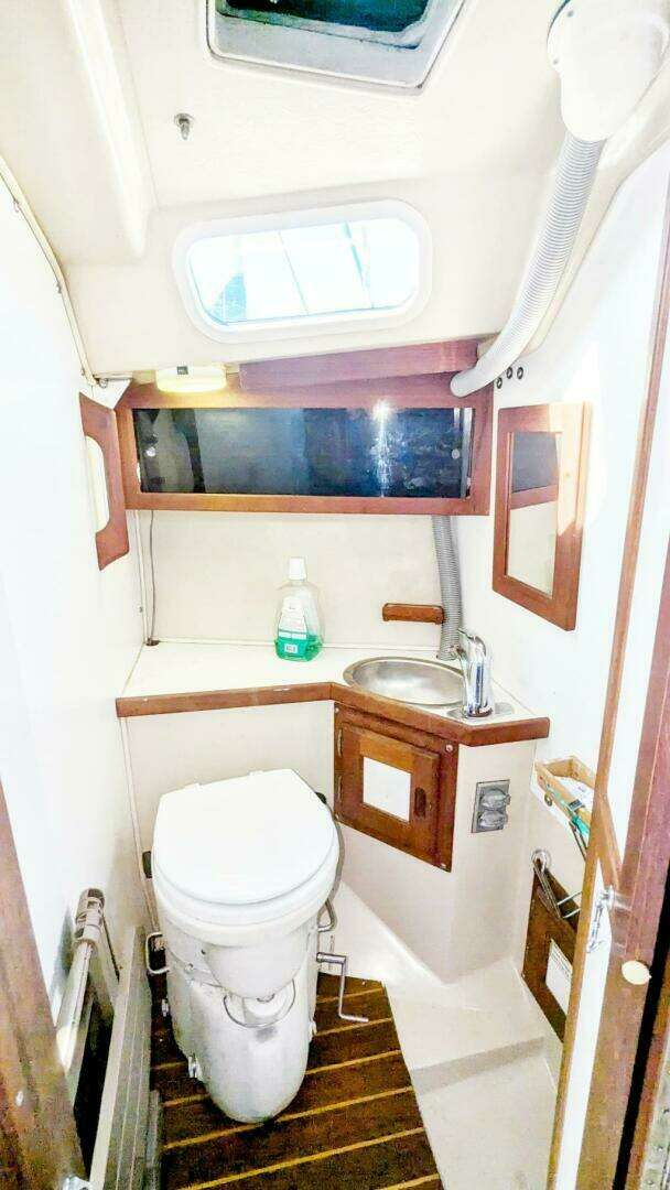 - Head: A fully enclosed head compartment with a marine toilet, sink, vanity, and shower is located forward of the main salon, between it and the V-berth cabin.