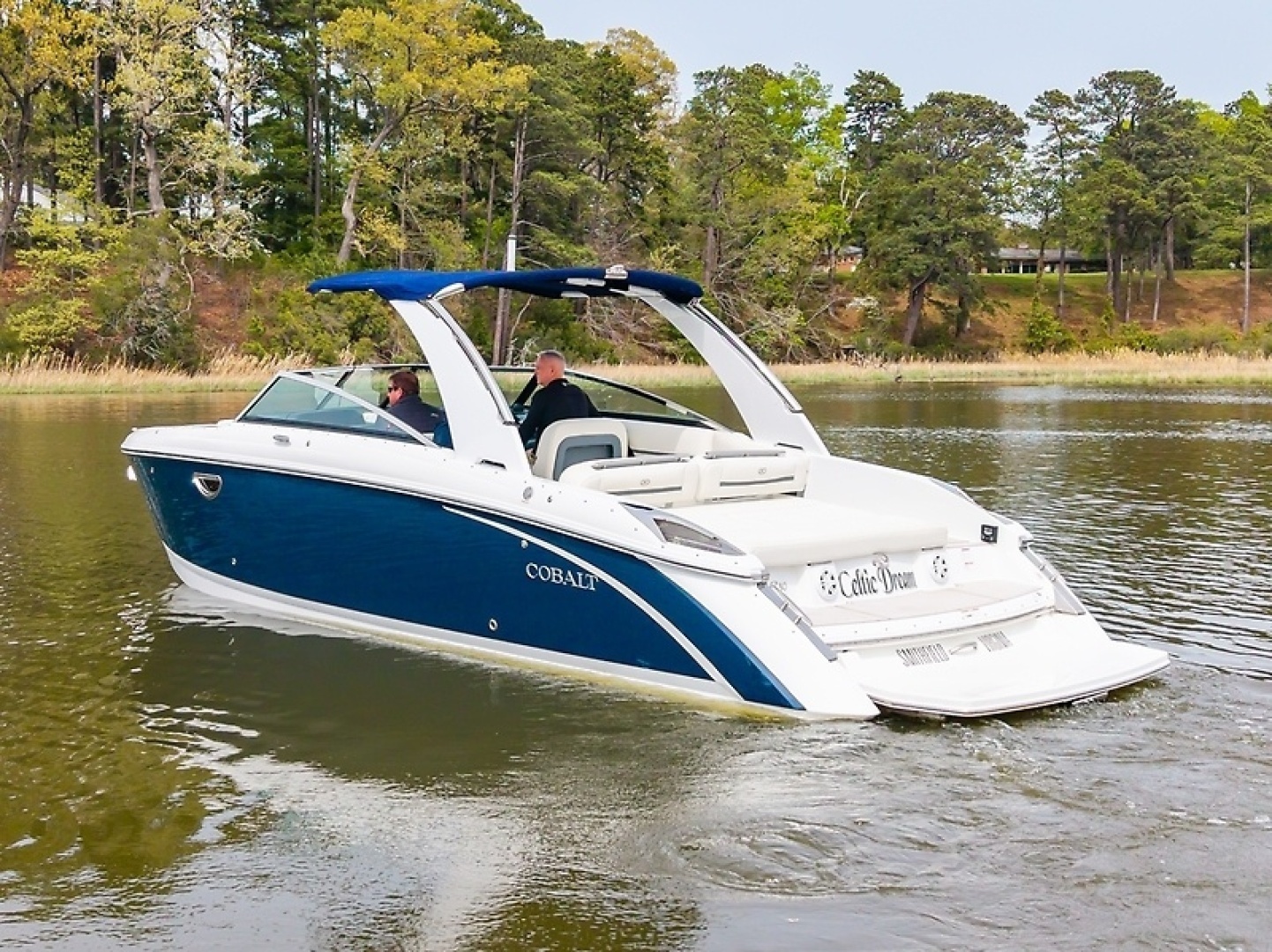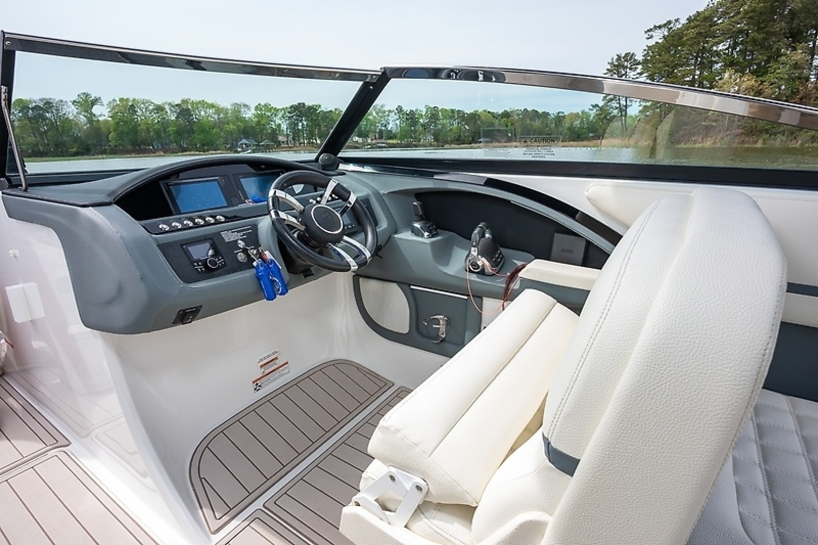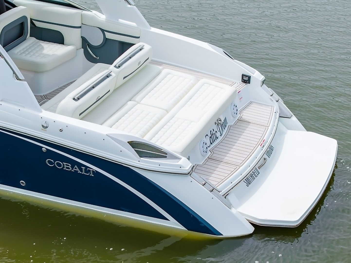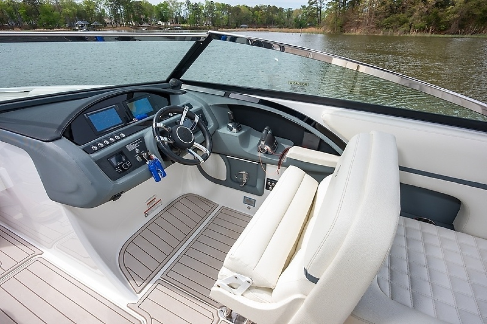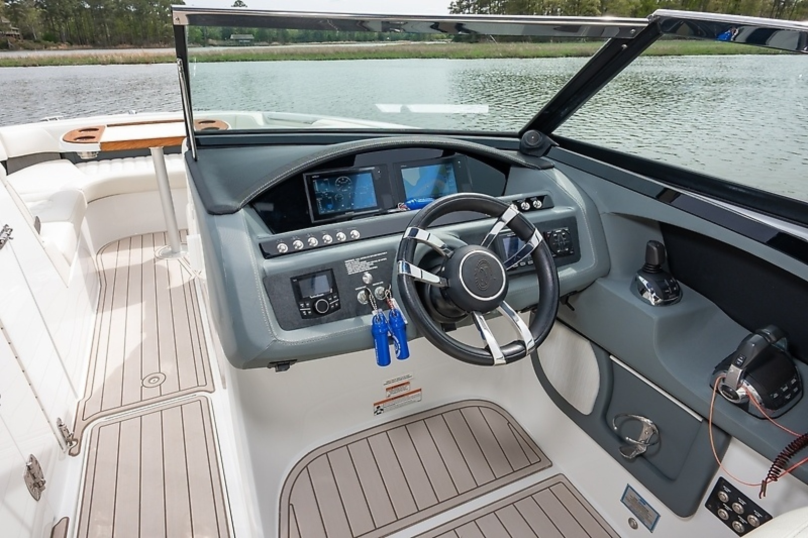 The COBALT R30 – a luxurious open-bow day boat designed with “Free Space Reclamation”, Cobalt’s exclusive technique for cockpit maximization. Elegant and expansive seating options combine with its endless storage spaces to provide the legendary ride that Cobalt is famous for. The largest of the BR Series, the R30 also features an electric actuated swim step that lowers to just below the water’s surface. Also astern, find a beach of a sunpad – large enough for four sun worshipers. And when it comes time to gather around for some good fun and conversation, make useful our convertible layout in the cockpit. Lounge the seats forward or aft, gather around the teak-adorned cockpit table or covert the area into a couch oasis with filler cushions. The port side features a head compartment that doubles as a changing room. At the helm, the captain will find the glass cockpit design provides a birds-eye-view for a safe and enjoyable day on the water – equipped with Garmin screens that keep your systems and route in view at all times. We cannot forget about the joystick control with its easy maneuverability and simple operation.