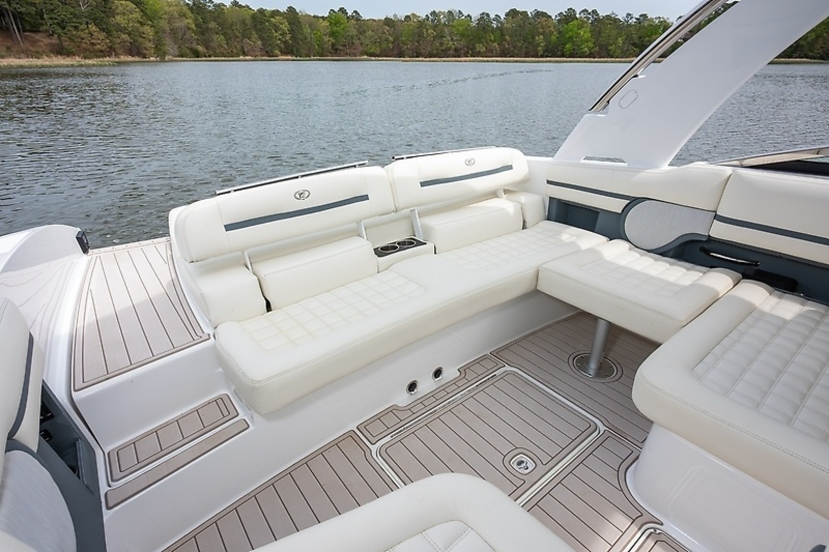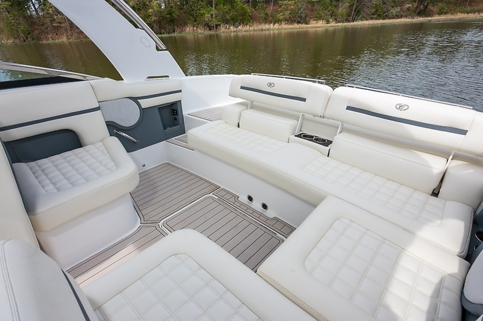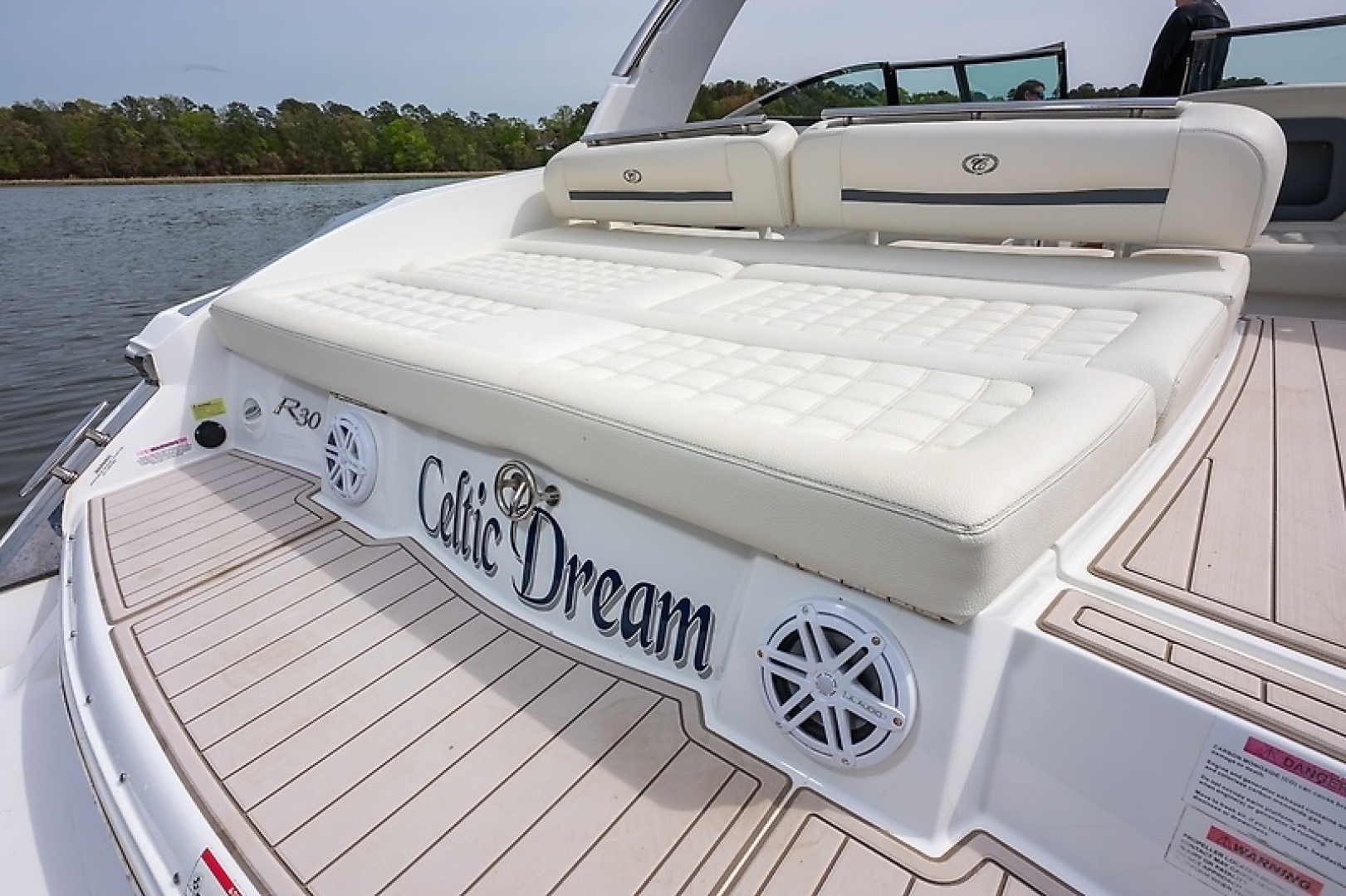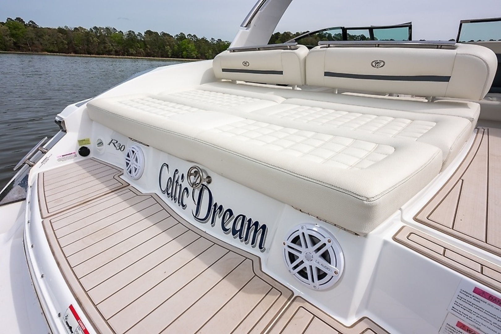 The COBALT R30 – a luxurious open-bow day boat designed with “Free Space Reclamation”, Cobalt’s exclusive technique for cockpit maximization. Elegant and expansive seating options combine with its endless storage spaces to provide the legendary ride that Cobalt is famous for. The largest of the BR Series, the R30 also features an electric actuated swim step that lowers to just below the water’s surface. Also astern, find a beach of a sunpad – large enough for four sun worshipers. And when it comes time to gather around for some good fun and conversation, make useful our convertible layout in the cockpit. Lounge the seats forward or aft, gather around the teak-adorned cockpit table or covert the area into a couch oasis with filler cushions. The port side features a head compartment that doubles as a changing room. At the helm, the captain will find the glass cockpit design provides a birds-eye-view for a safe and enjoyable day on the water – equipped with Garmin screens that keep your systems and route in view at all times. We cannot forget about the joystick control with its easy maneuverability and simple operation.