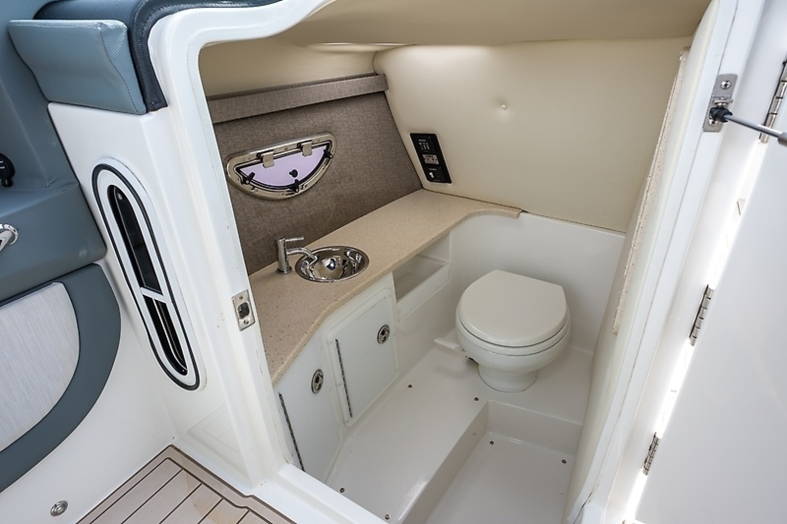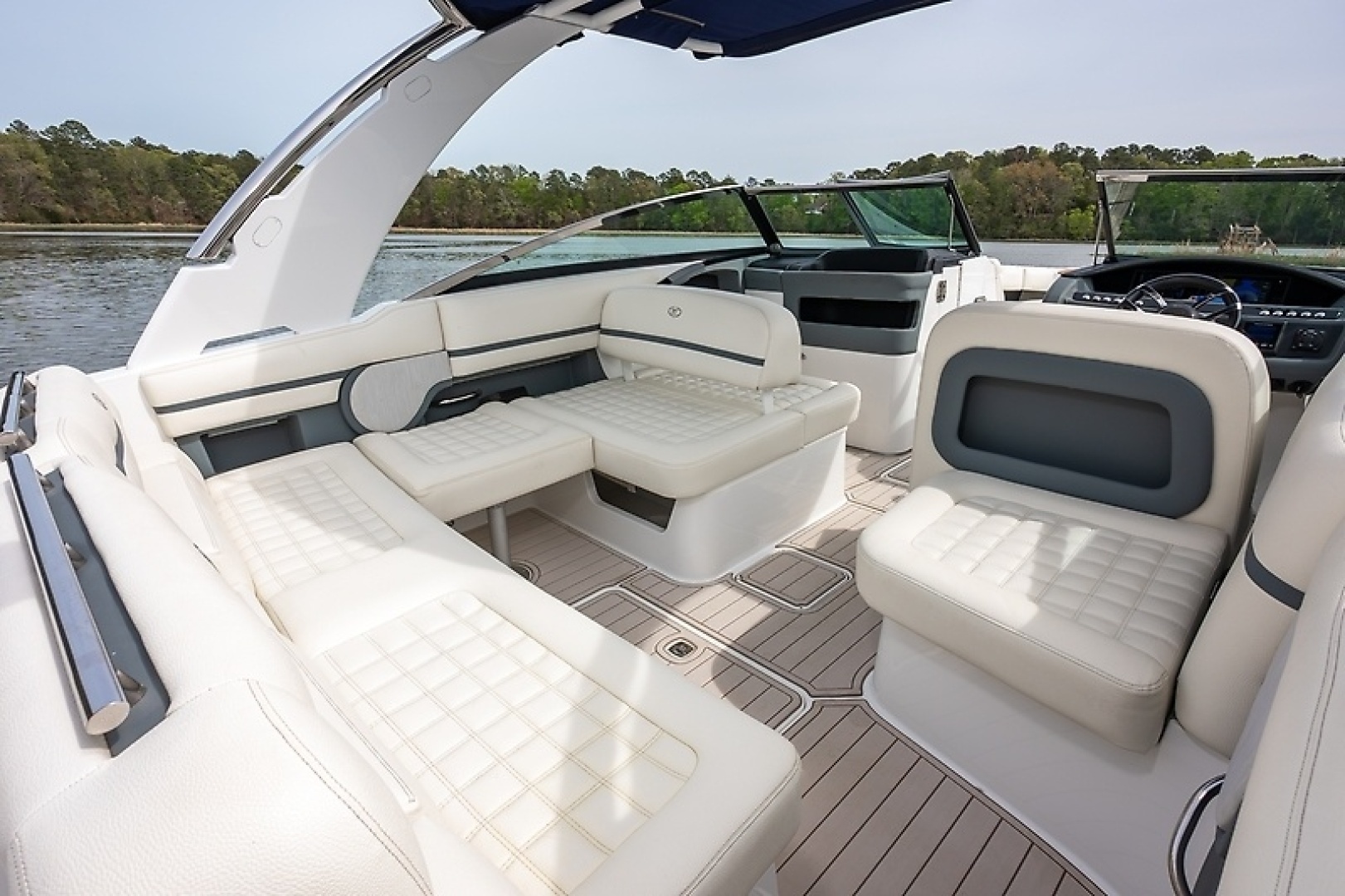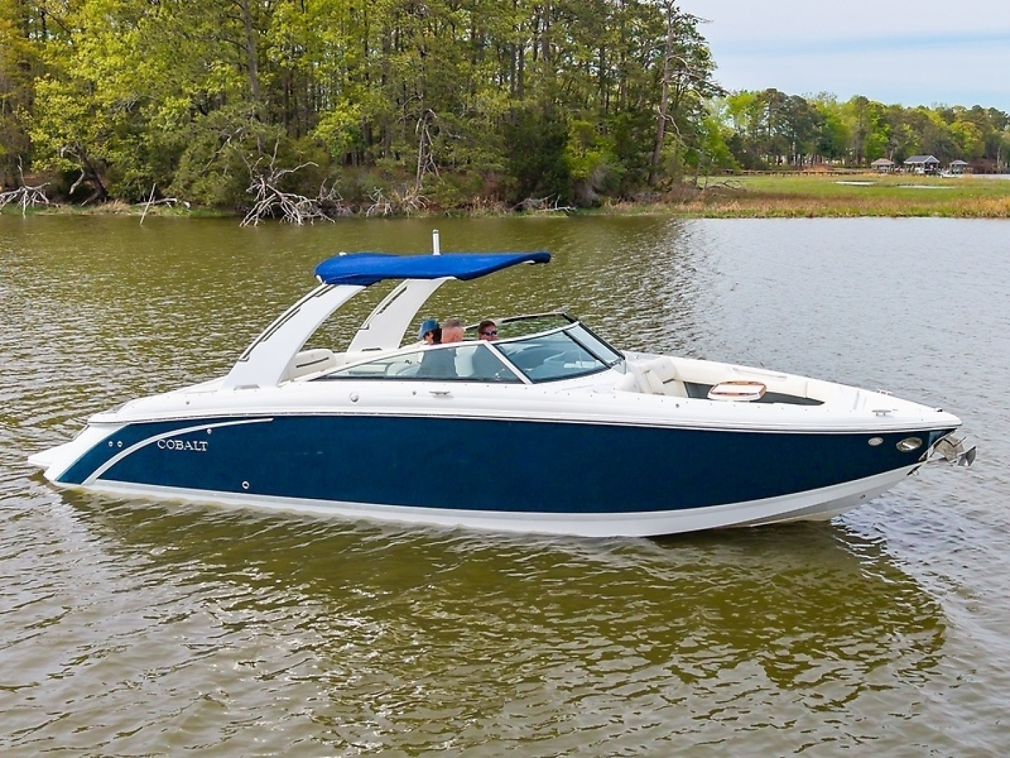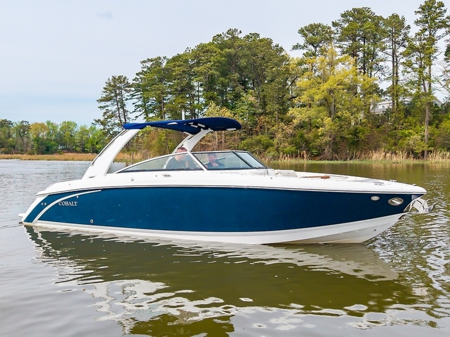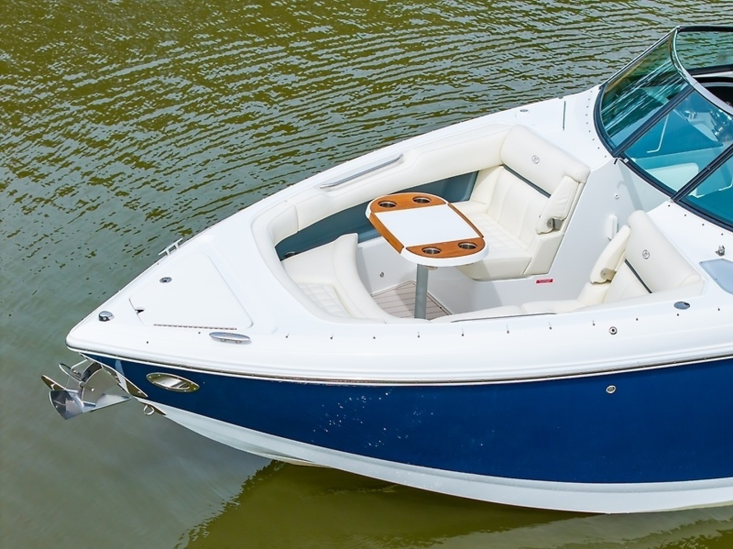 The COBALT R30 – a luxurious open-bow day boat designed with “Free Space Reclamation”, Cobalt’s exclusive technique for cockpit maximization. Elegant and expansive seating options combine with its endless storage spaces to provide the legendary ride that Cobalt is famous for. The largest of the BR Series, the R30 also features an electric actuated swim step that lowers to just below the water’s surface. Also astern, find a beach of a sunpad – large enough for four sun worshipers. And when it comes time to gather around for some good fun and conversation, make useful our convertible layout in the cockpit. Lounge the seats forward or aft, gather around the teak-adorned cockpit table or covert the area into a couch oasis with filler cushions. The port side features a head compartment that doubles as a changing room. At the helm, the captain will find the glass cockpit design provides a birds-eye-view for a safe and enjoyable day on the water – equipped with Garmin screens that keep your systems and route in view at all times. We cannot forget about the joystick control with its easy maneuverability and simple operation.