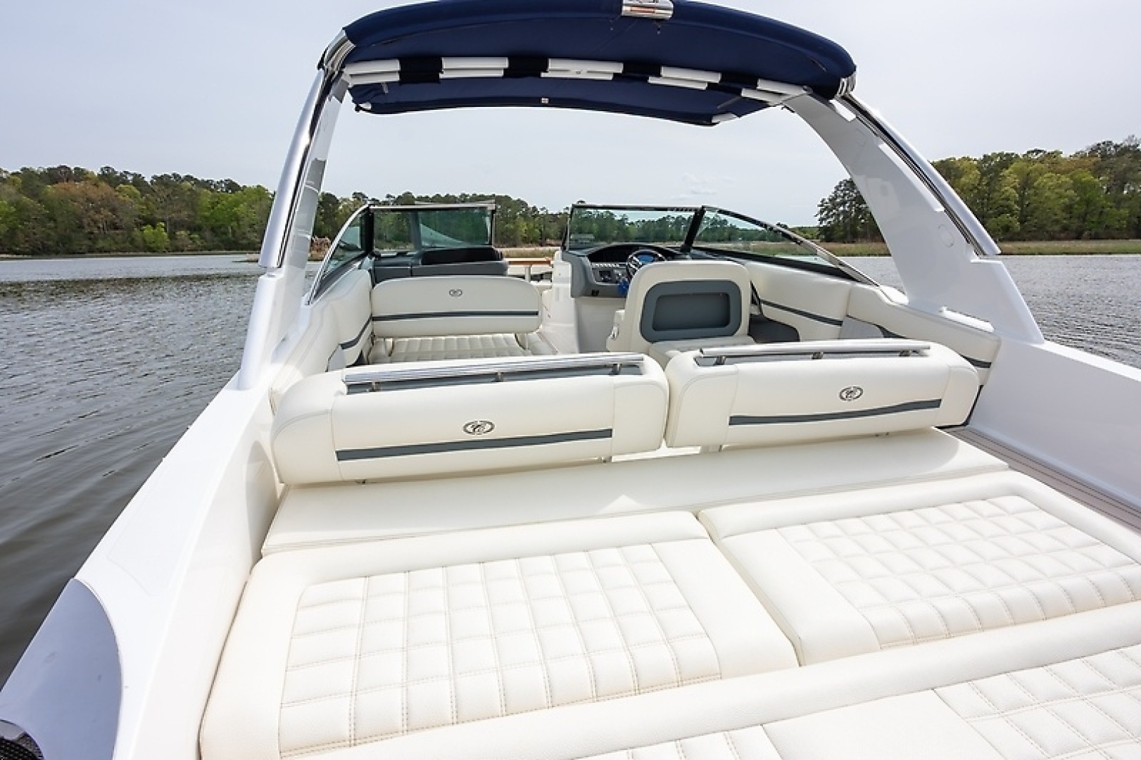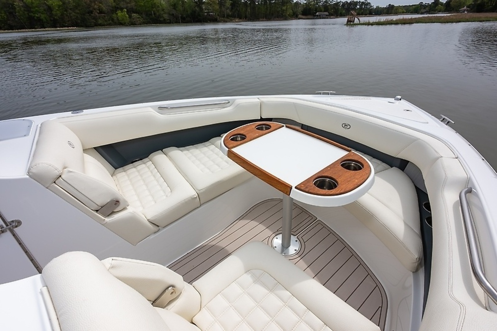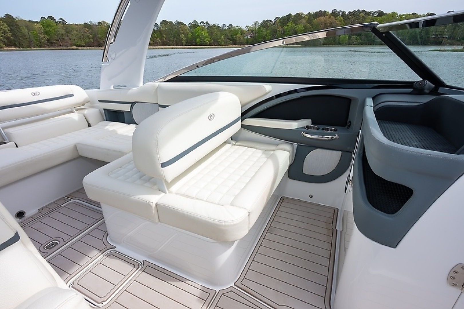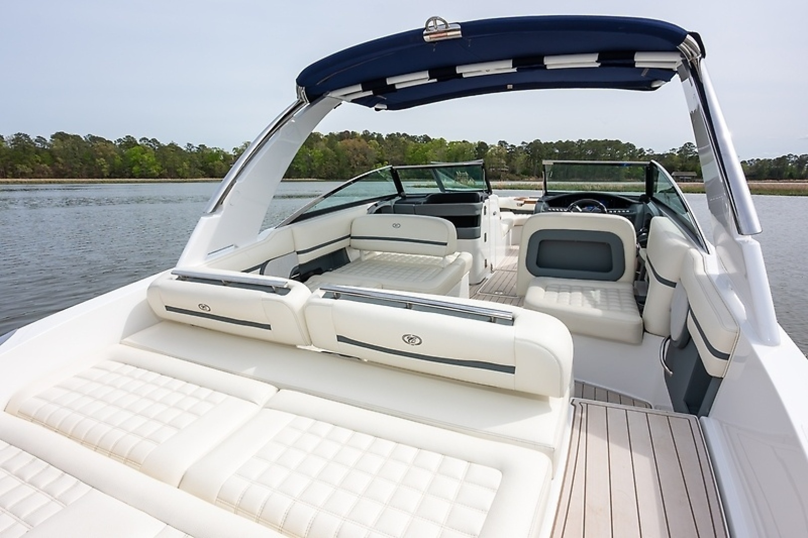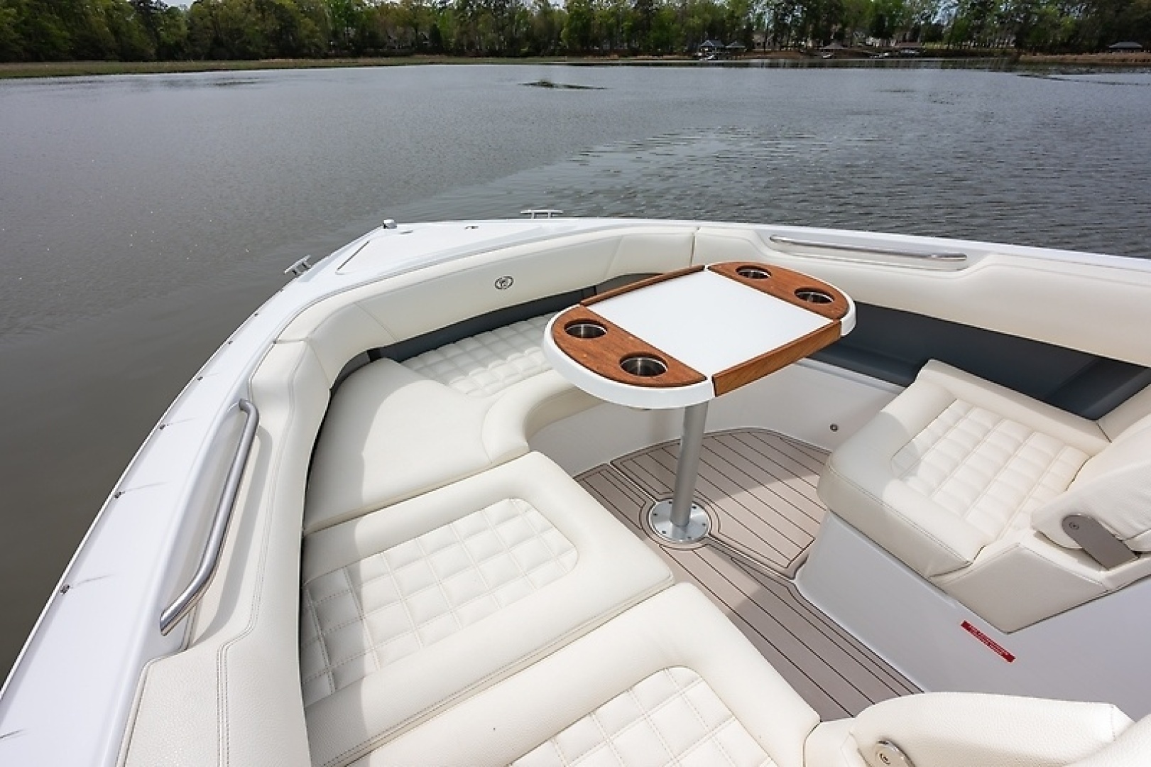The COBALT R30 – a luxurious open-bow day boat designed with “Free Space Reclamation”, Cobalt’s exclusive technique for cockpit maximization. Elegant and expansive seating options combine with its endless storage spaces to provide the legendary ride that Cobalt is famous for. The largest of the BR Series, the R30 also features an electric actuated swim step that lowers to just below the water’s surface. Also astern, find a beach of a sunpad – large enough for four sun worshipers. And when it comes time to gather around for some good fun and conversation, make useful our convertible layout in the cockpit. Lounge the seats forward or aft, gather around the teak-adorned cockpit table or covert the area into a couch oasis with filler cushions. The port side features a head compartment that doubles as a changing room. At the helm, the captain will find the glass cockpit design provides a birds-eye-view for a safe and enjoyable day on the water – equipped with Garmin screens that keep your systems and route in view at all times. We cannot forget about the joystick control with its easy maneuverability and simple operation.