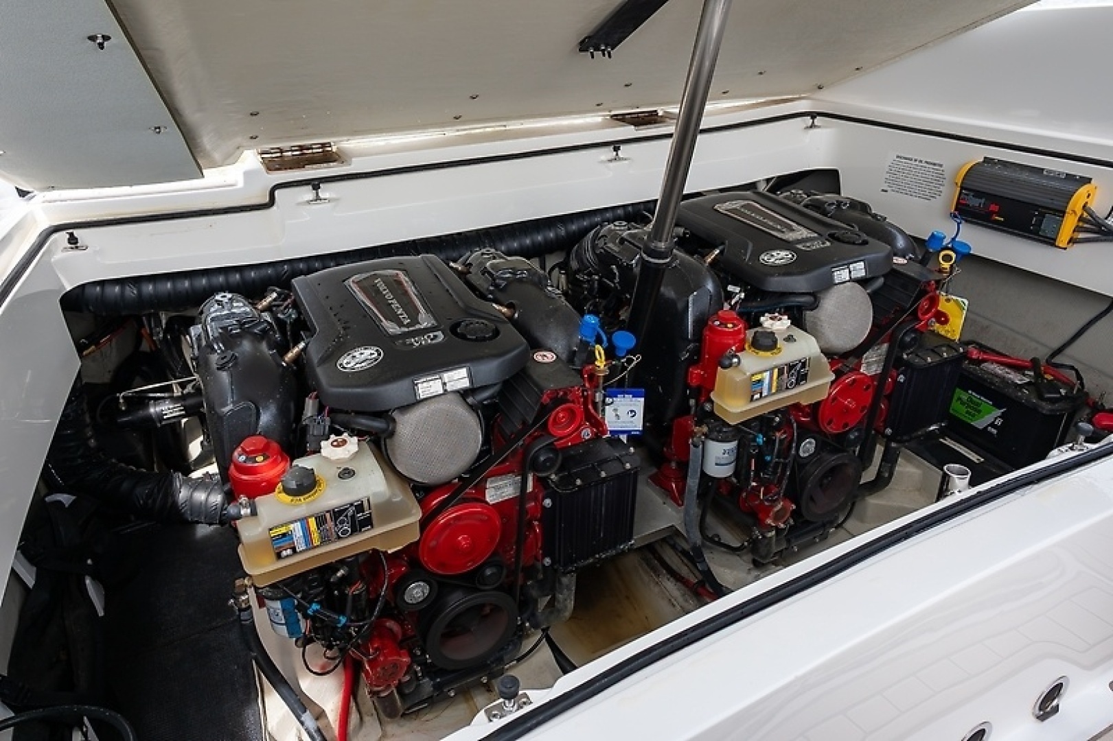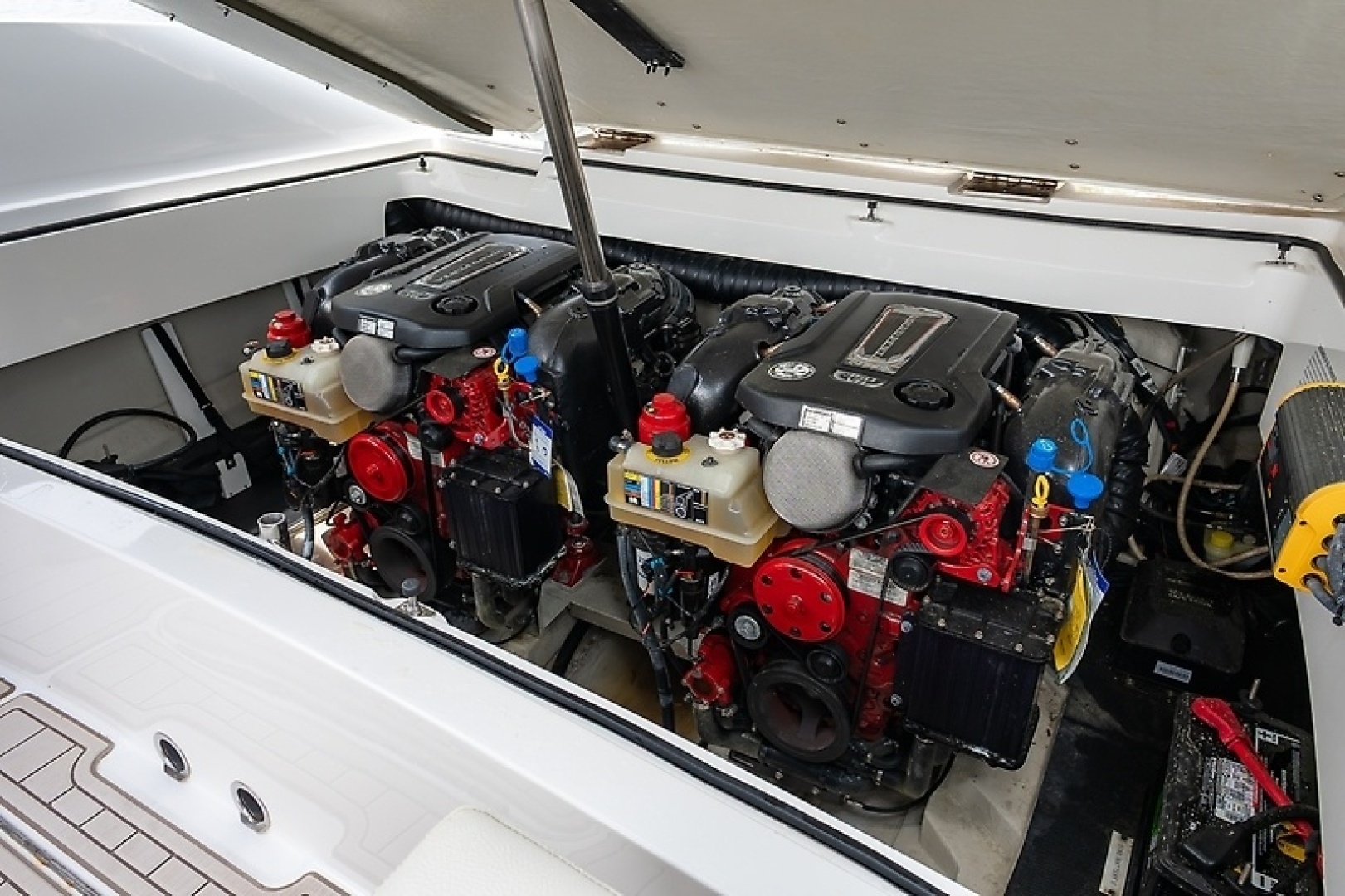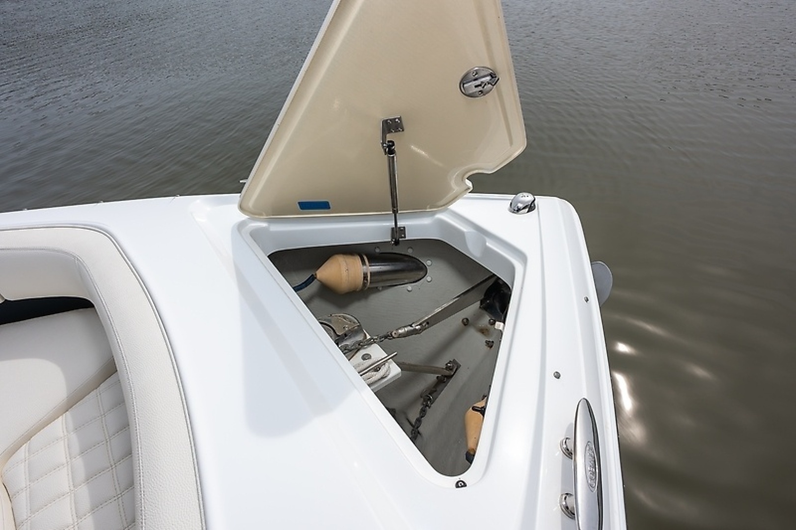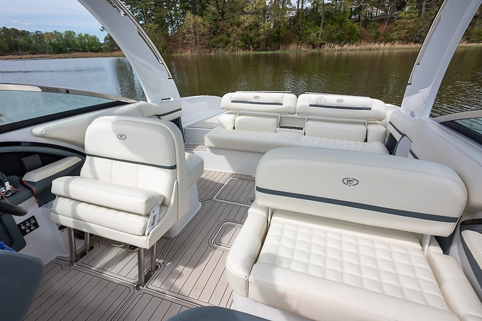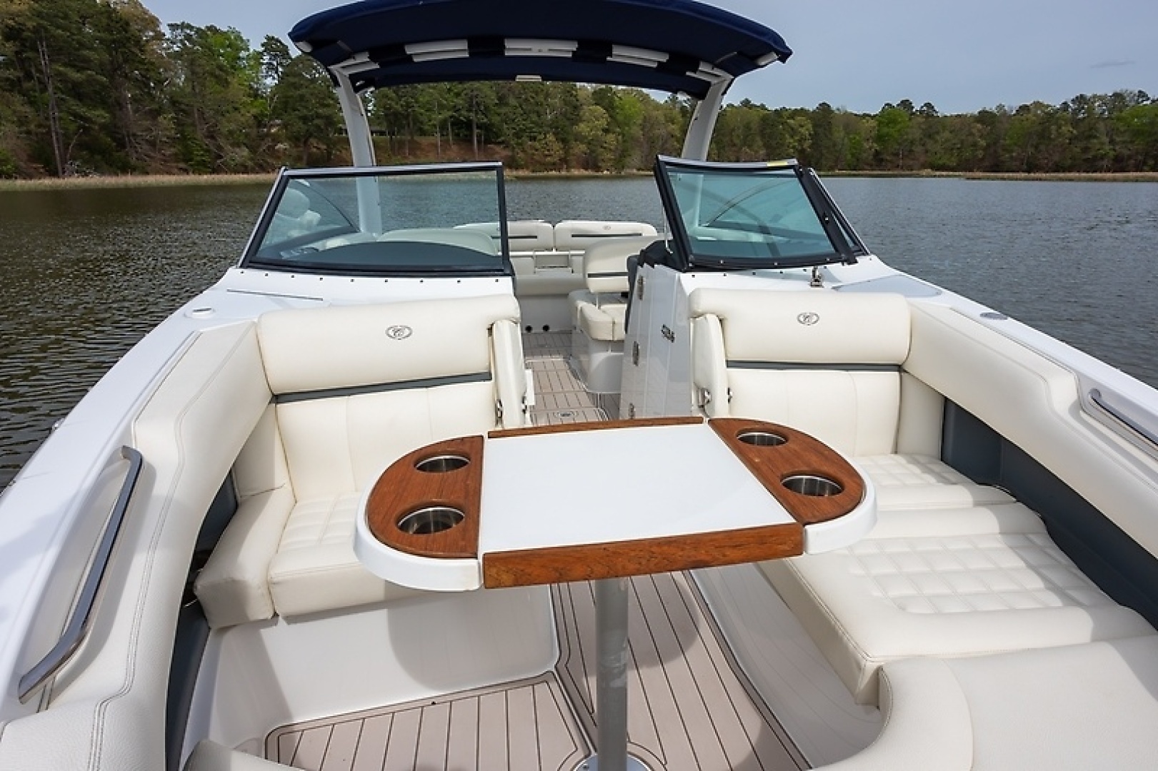 The COBALT R30 – a luxurious open-bow day boat designed with “Free Space Reclamation”, Cobalt’s exclusive technique for cockpit maximization. Elegant and expansive seating options combine with its endless storage spaces to provide the legendary ride that Cobalt is famous for. The largest of the BR Series, the R30 also features an electric actuated swim step that lowers to just below the water’s surface. Also astern, find a beach of a sunpad – large enough for four sun worshipers. And when it comes time to gather around for some good fun and conversation, make useful our convertible layout in the cockpit. Lounge the seats forward or aft, gather around the teak-adorned cockpit table or covert the area into a couch oasis with filler cushions. The port side features a head compartment that doubles as a changing room. At the helm, the captain will find the glass cockpit design provides a birds-eye-view for a safe and enjoyable day on the water – equipped with Garmin screens that keep your systems and route in view at all times. We cannot forget about the joystick control with its easy maneuverability and simple operation.