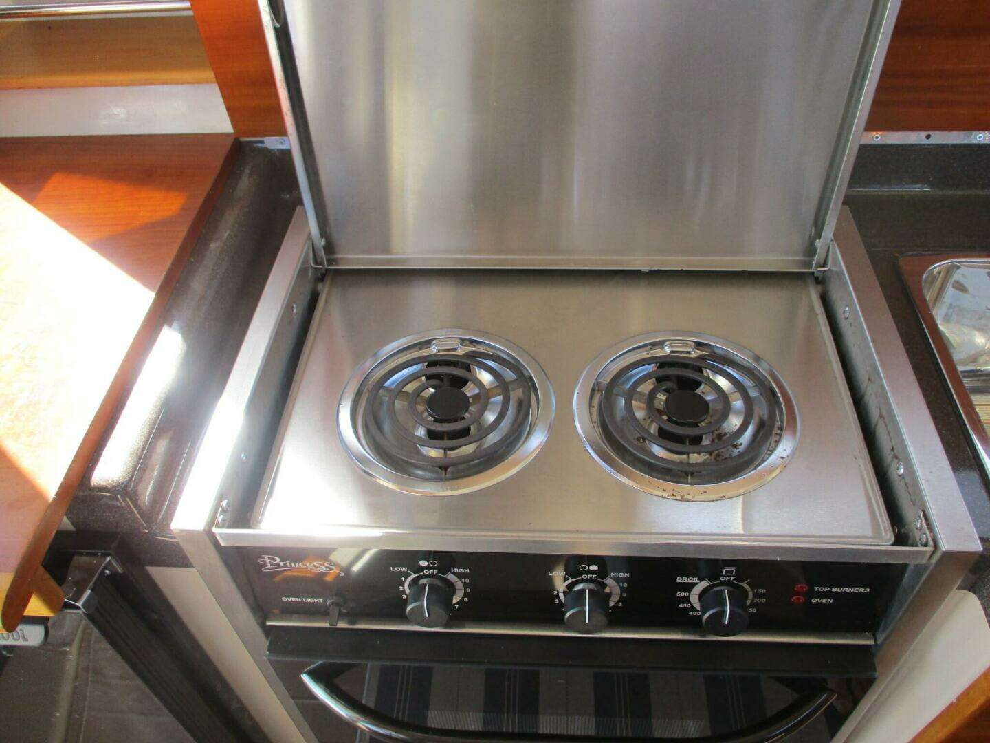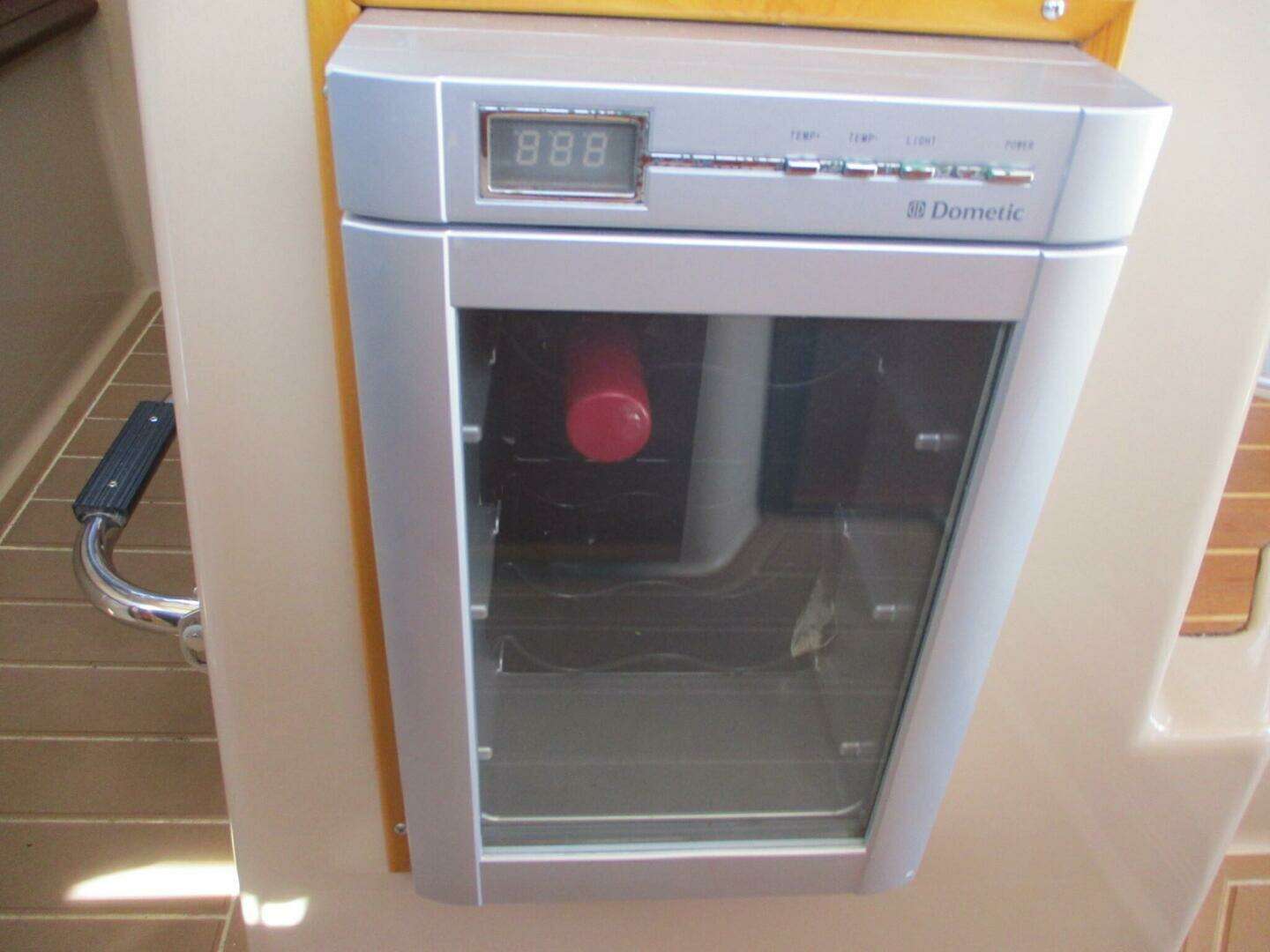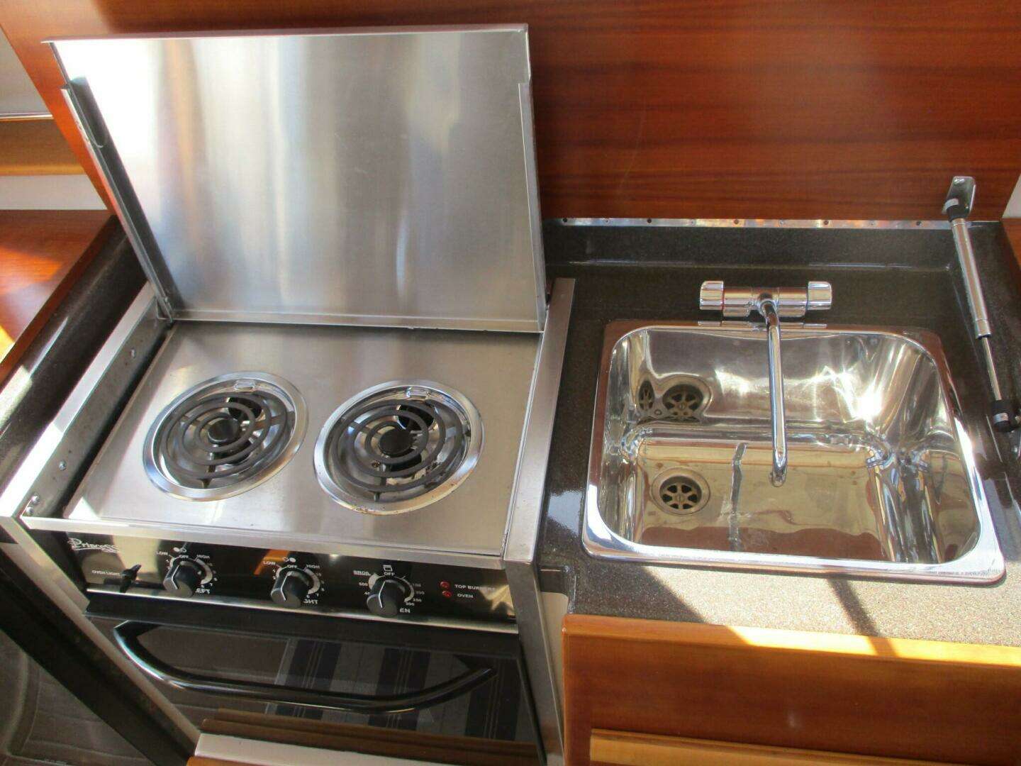 The galley has a refrigerator, dual burner cooktop/oven and a wine cooler.