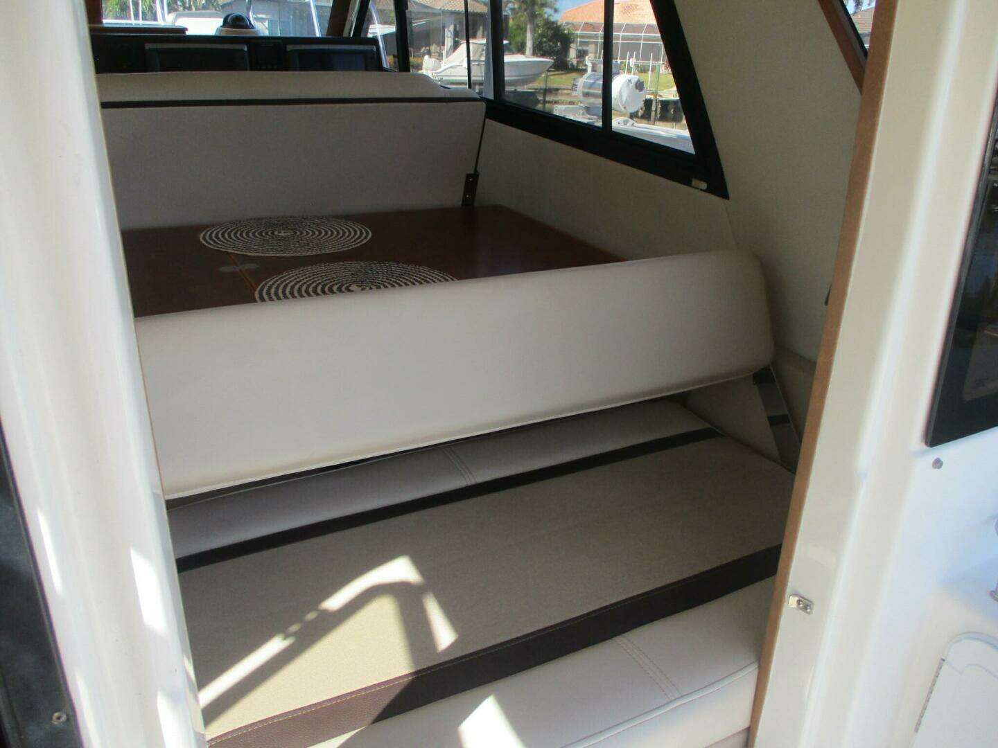 This a unique design, offering sleeping arrangements for four (six in a pinch), plenty of cockpit seating and also good seating on the flybridge. In-coaming fold out seats both port and starboard allow for a spacious cockpit when they are not in use. There is a swing up window on the forward cockpit bulkhead that allows for extra seating when entertaining- the aft dinette seat has a reversible seat back for using when the window is lifted up.