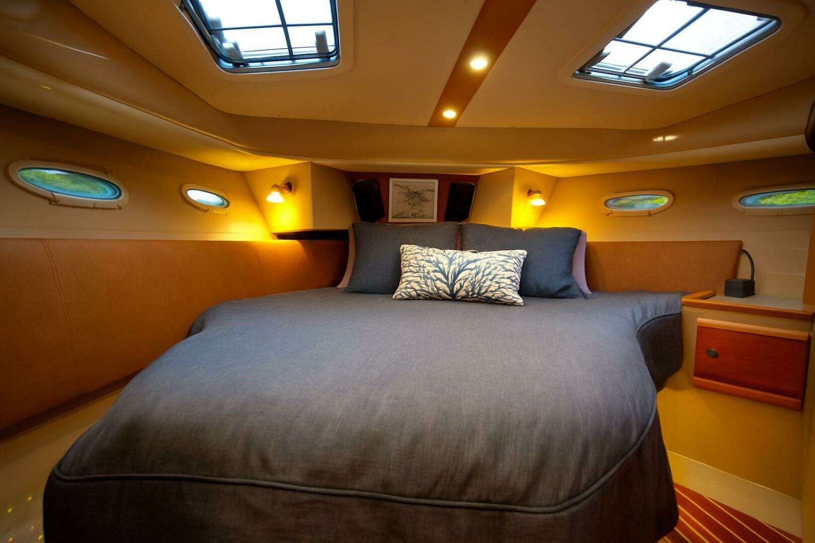 Down below a large berth and clever storage solutions make the primary cabin very comfortable for extended cruising. Custom bedding elevates the space and the ensuite head is well appointed with a separated enclosed shower.
