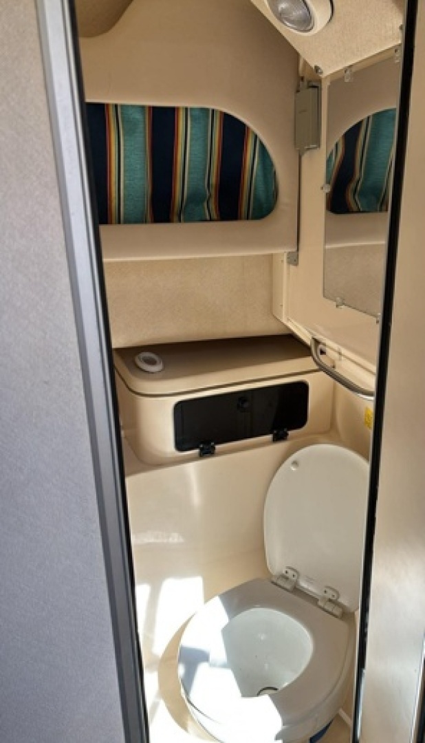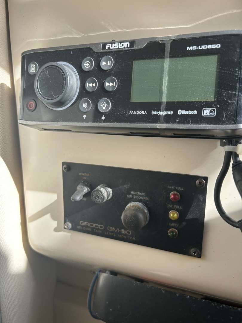 A generous open cockpit features a 30-gallon standup livewell, a rigging station with tackle storage, an insulated fish box, and gunnel rod holders, an aft-facing bench seat w/storage, port & starboard outriggers, and an integrated swim/dive platform - with ample space for avid anglers and comfortable cruisability. Below deck, she easily sleeps four with a dinette/convertible double V-berth forward and a mid-cabin double berth, along with a full mini-Galley with a sink, a 1-burner stove, a Farberware microwave, and new NORCOLD refrigerator. Additional comforts include a new (2026) AC/heat system, a new FUSION stereo amplifier & sub-woofer speakers