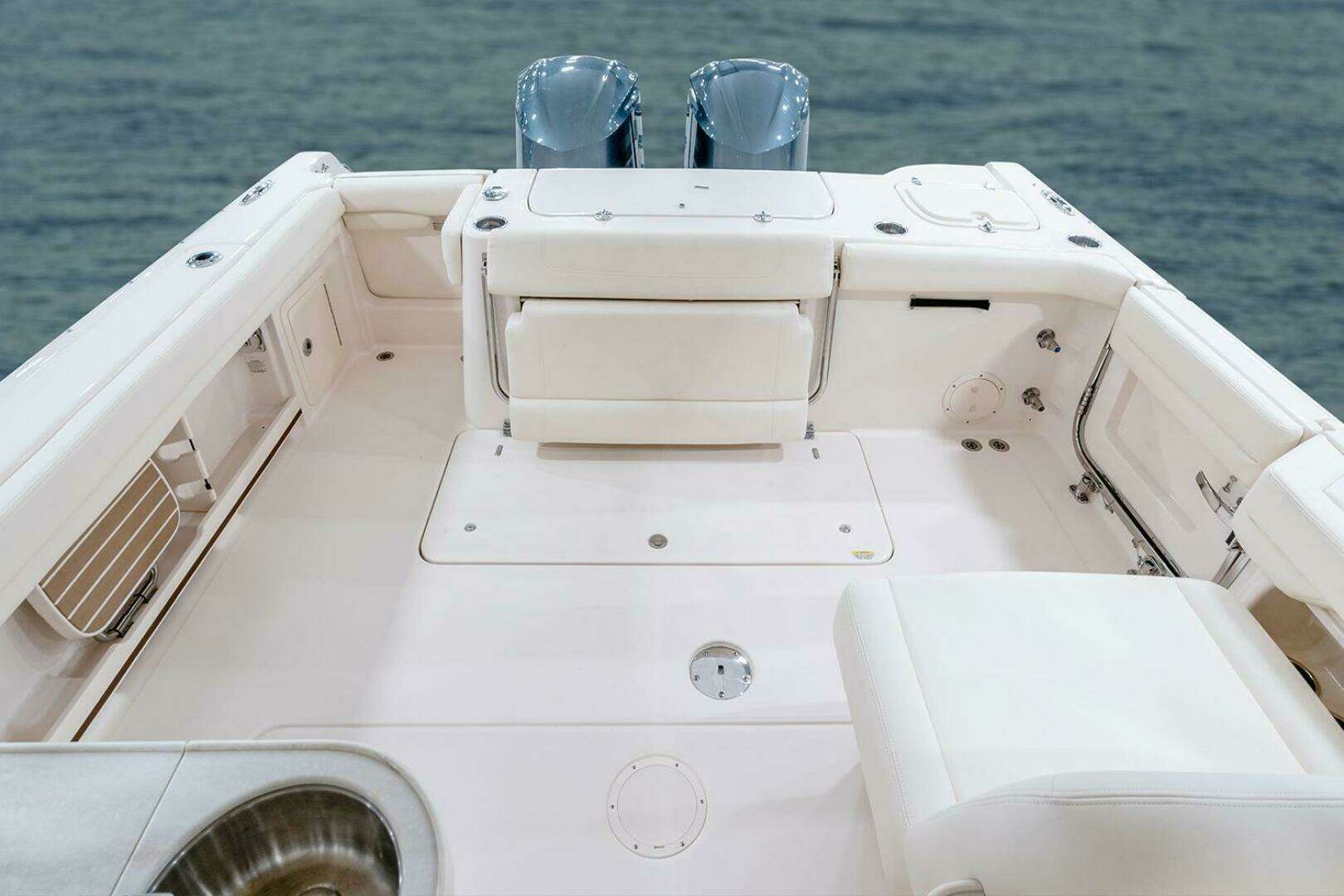 - Wet bar w/sink, storage drawers (3), trash bin & drink holders (2) (integrated with electromechanically adjustable helm seat)