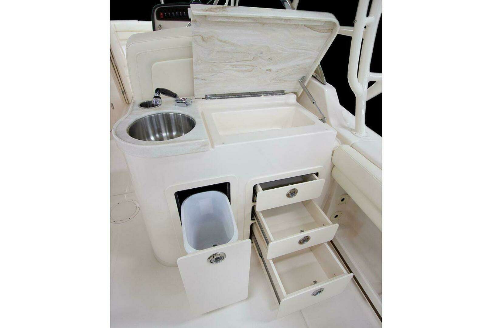- Wet bar w/sink, storage drawers (3), trash bin, drink holders (2) & fire extinguisher holder (integrated with electronically adjustable helm seat)