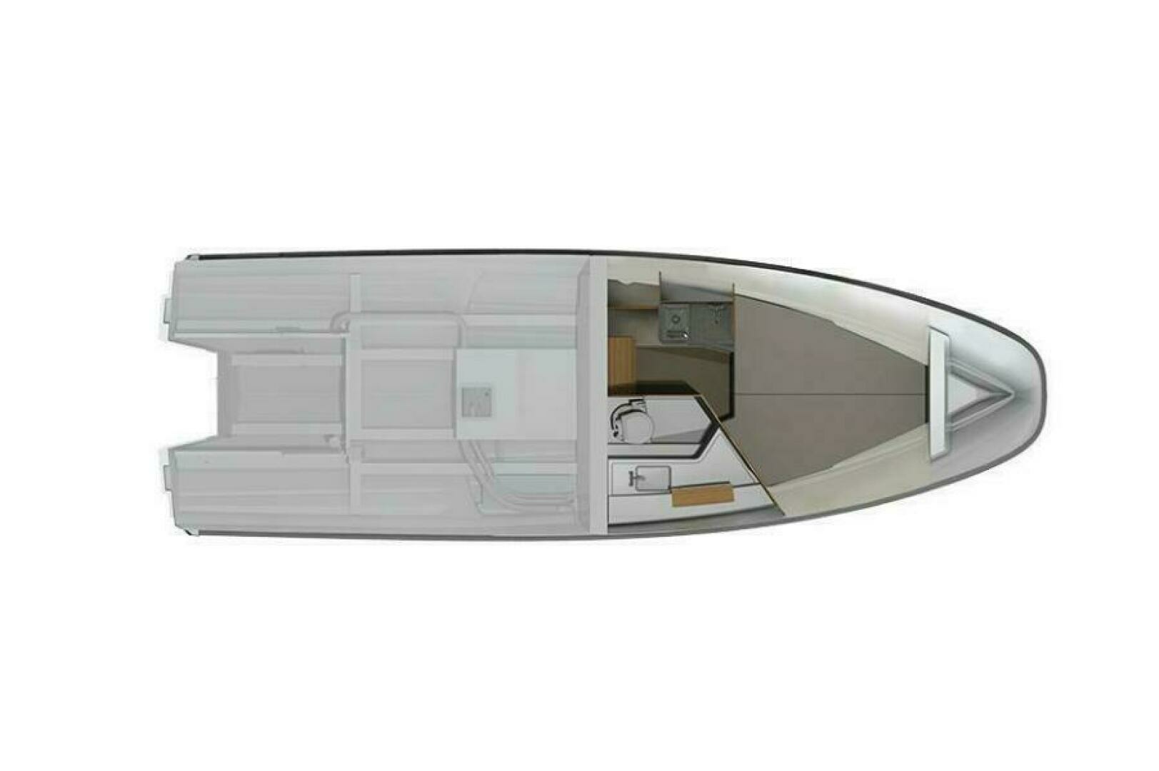 In place of the glass roof (fitted as standard), the boat can be equipped with an electronically opening canvas canopy, ideal for those wishing to optimize the open-air feeling on warm summer days. The driver’s position has space for two people and can be equipped with single 9″, 12″, or twin 12″ chart plotters. The foredeck features a large loading hatch with access to the cabin as well as an optional daybed which creates an extra seating area that seats 4 people with either a table or extended sunbed. The aft deck houses a wide sofa with ample stowage.