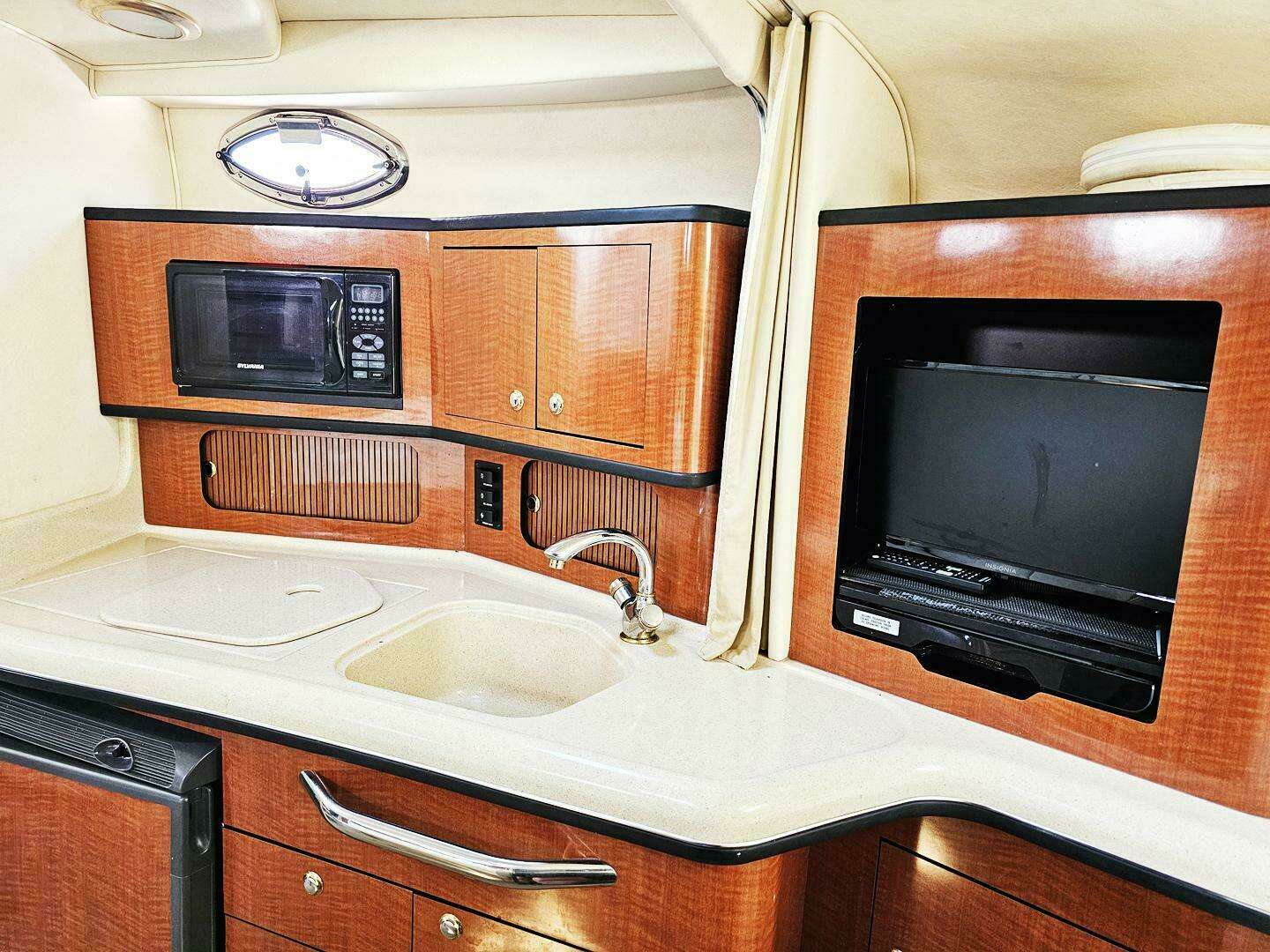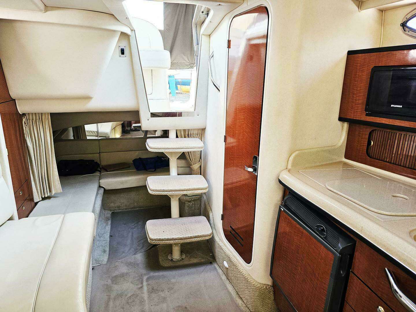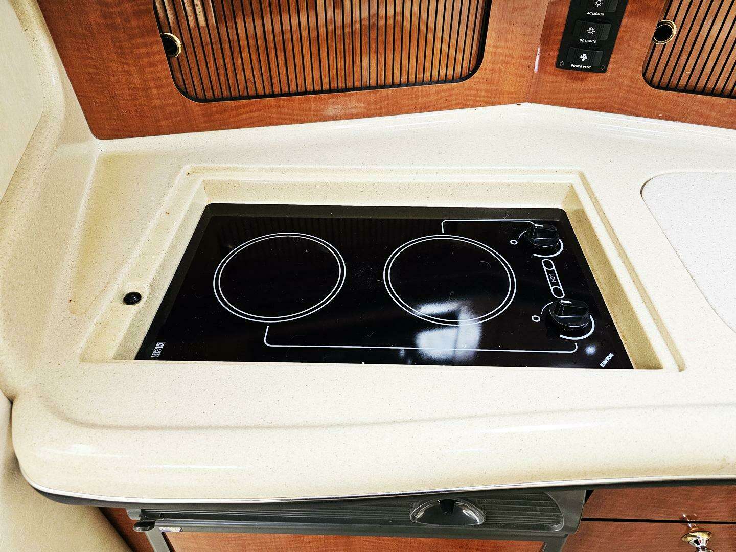 - Galley: Fully equipped with a microwave, two-burner electric stove, refrigerator, and sink with hot and cold water.