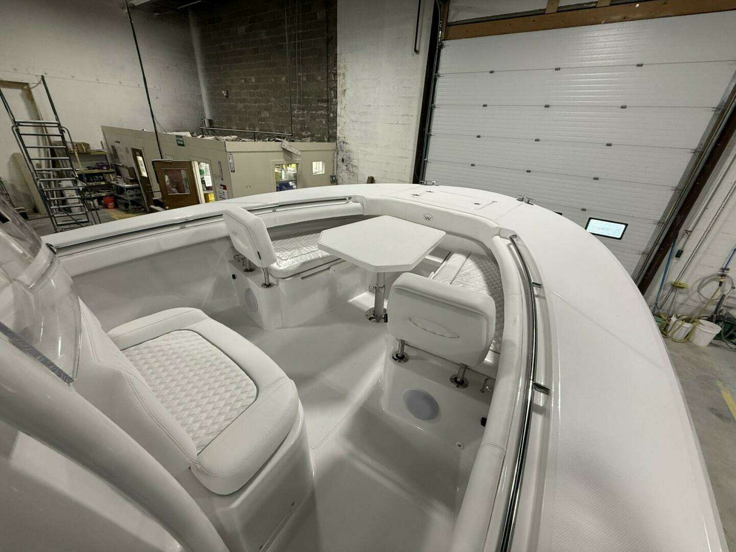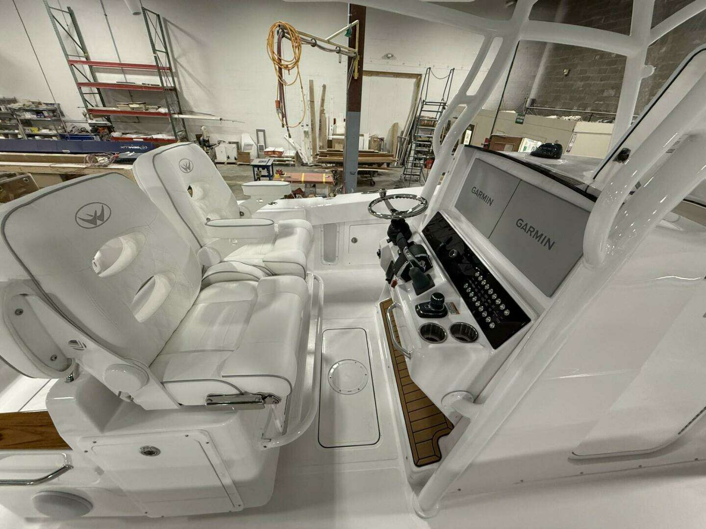 - Mezzanine Rear Facing Seating with Cooler Tubs Beneath Seats, Tackle Storage, Trash Can, Solid Surface Armrest Caps