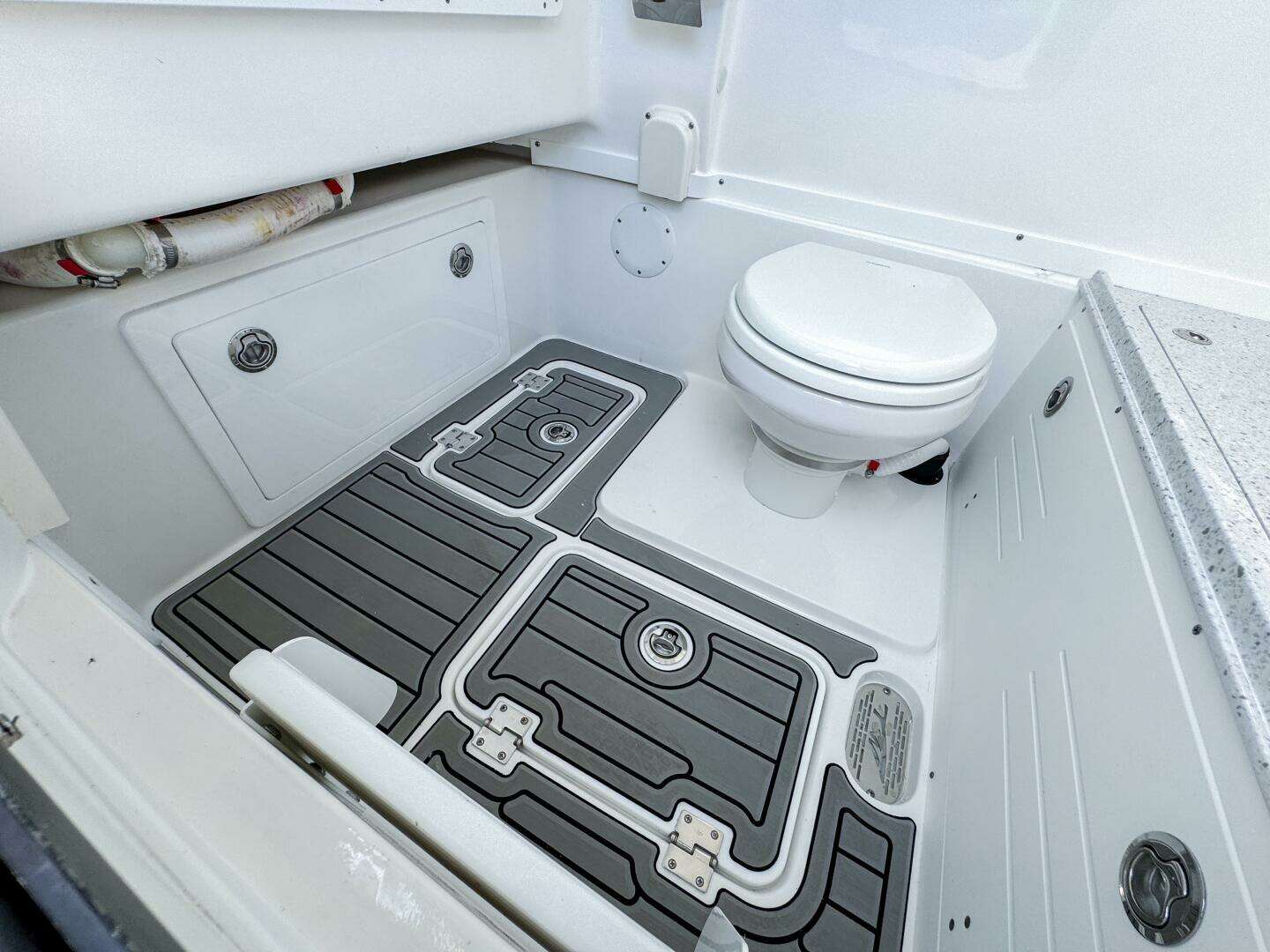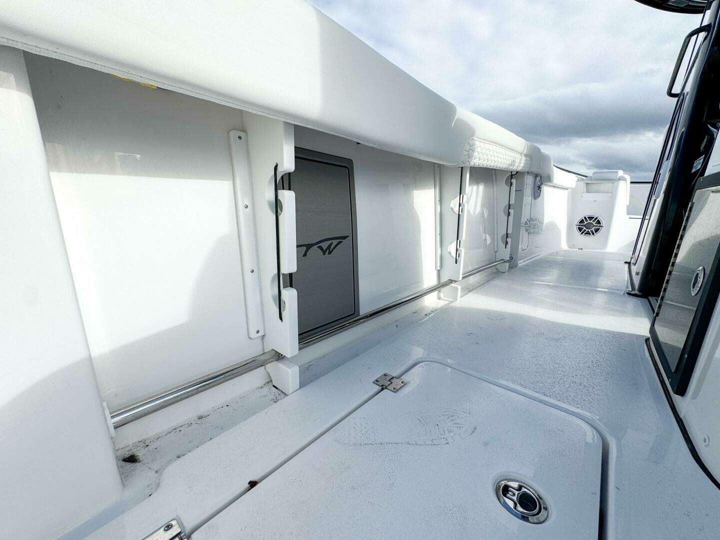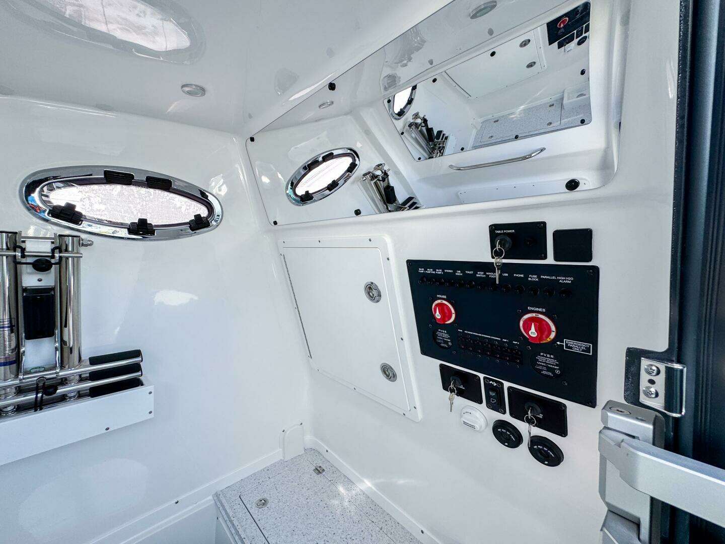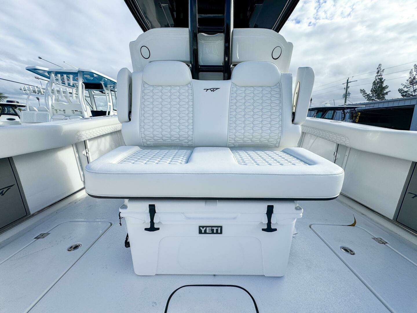 Designed for comfort and function, the cockpit features a mezzanine seat leaning post with insulated cooler, ideal for long offshore days. Fishing amenities include extra stainless steel rod holders at the bow and mid-ship, while Phender Pro fender cleats add practical convenience and hull protection. A 4-bank charger system supports onboard electronics and accessories.