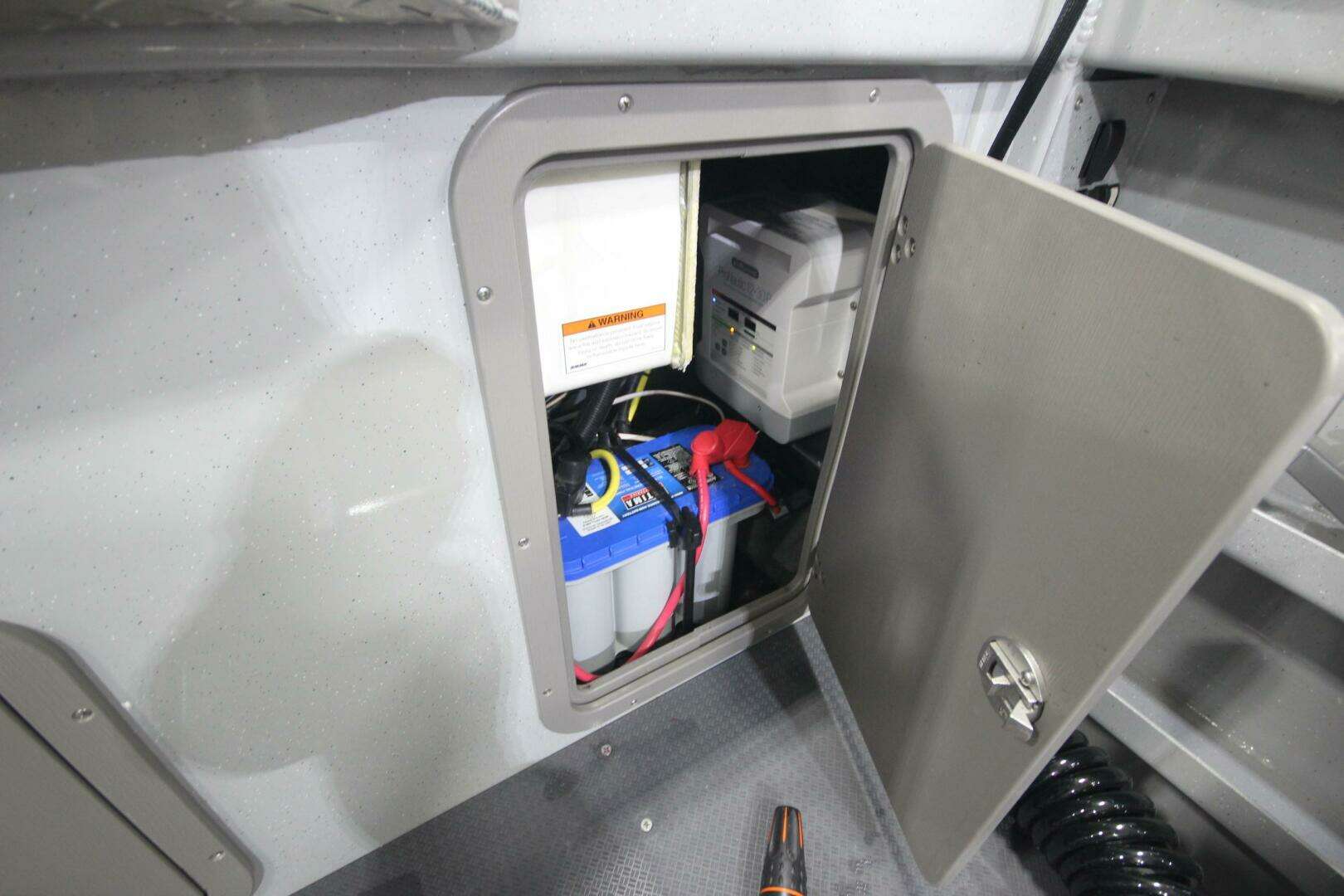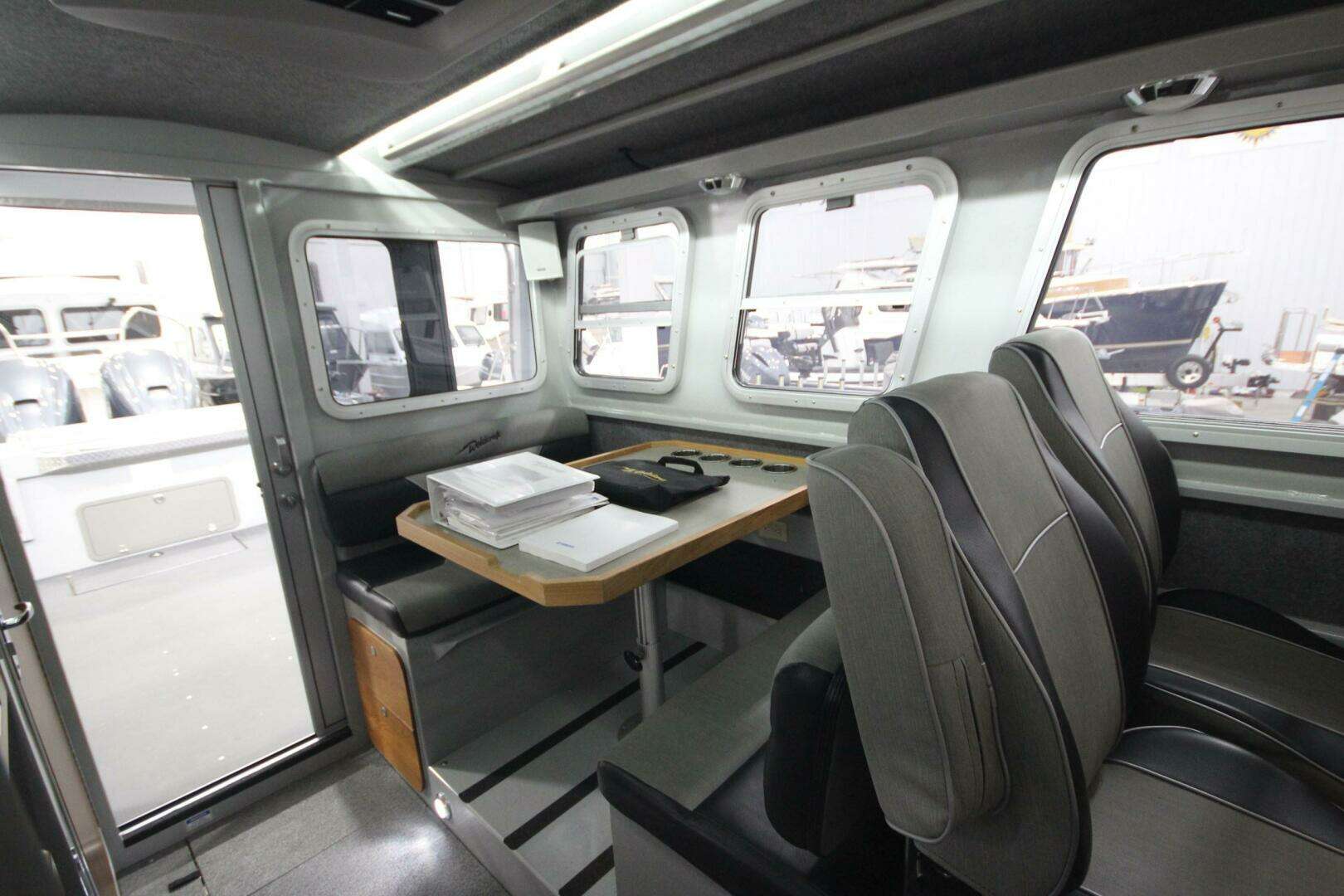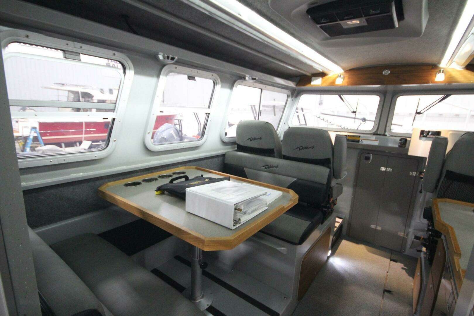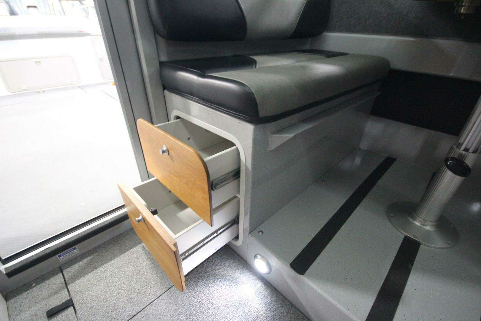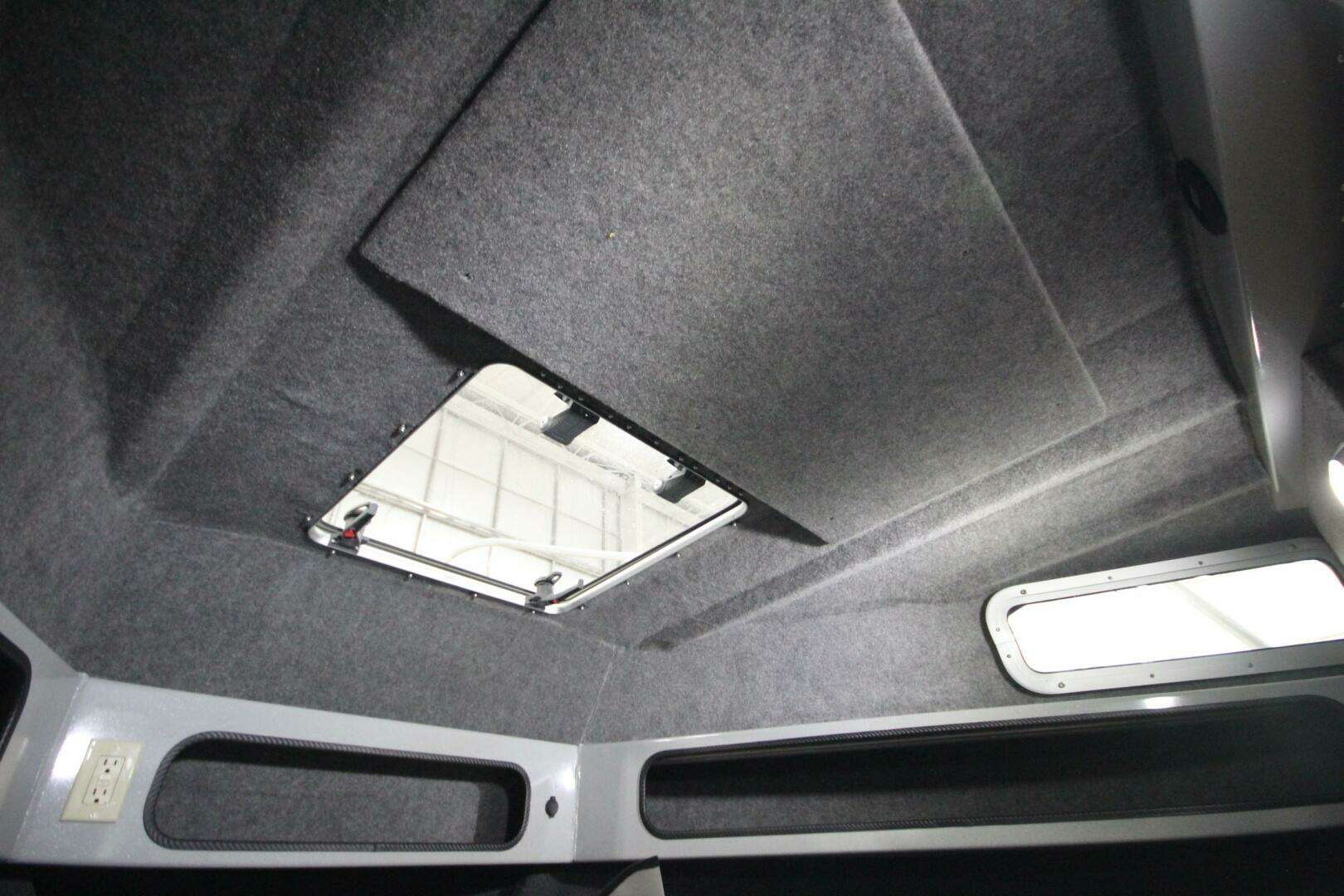 Cuddy cabin with 24" Lexan bow access hatch, side windows, storage, shelving, cushions, and 2 red/white LED cabin lights