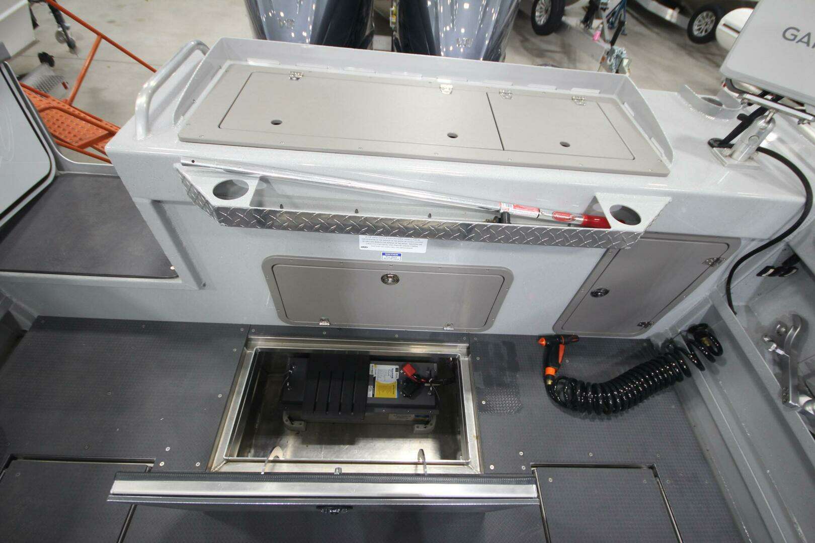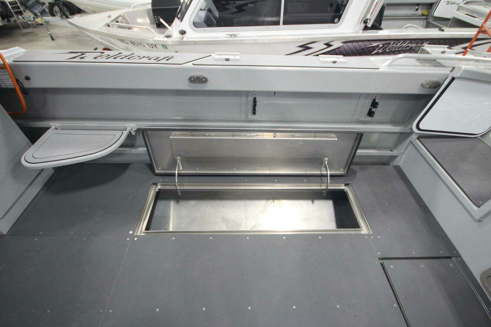 Dual aft sub-floor fish boxes with self draining lids and individual macerator pumps