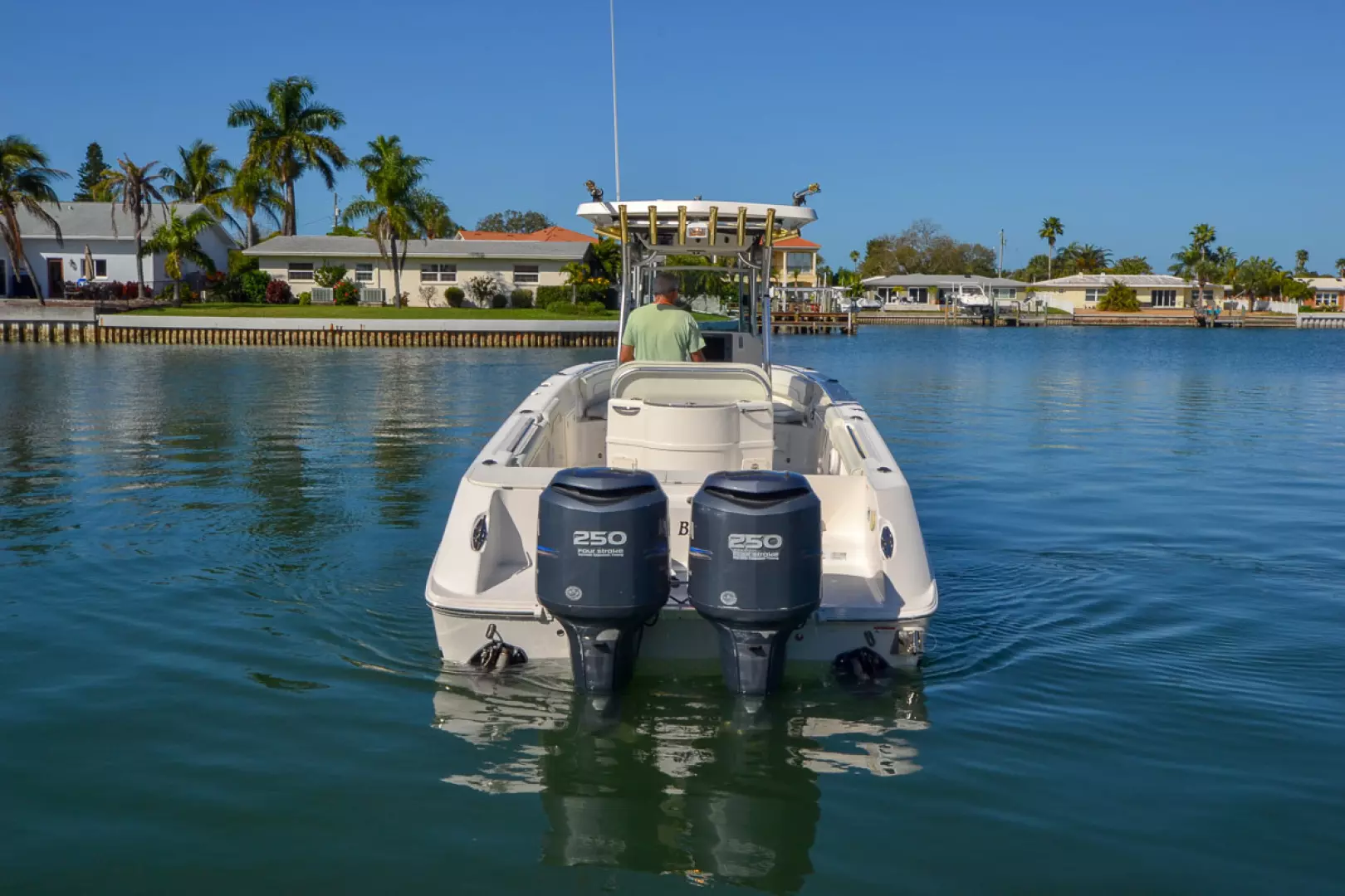 - T-top FRP with rod holders (8), spreader lights (2), electronics, box and PFD storage bags