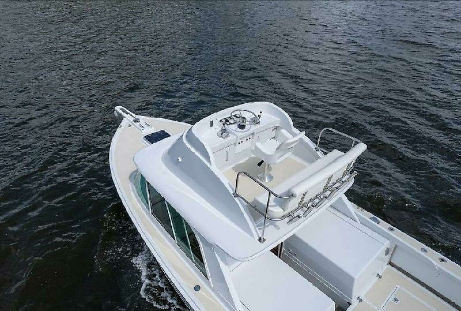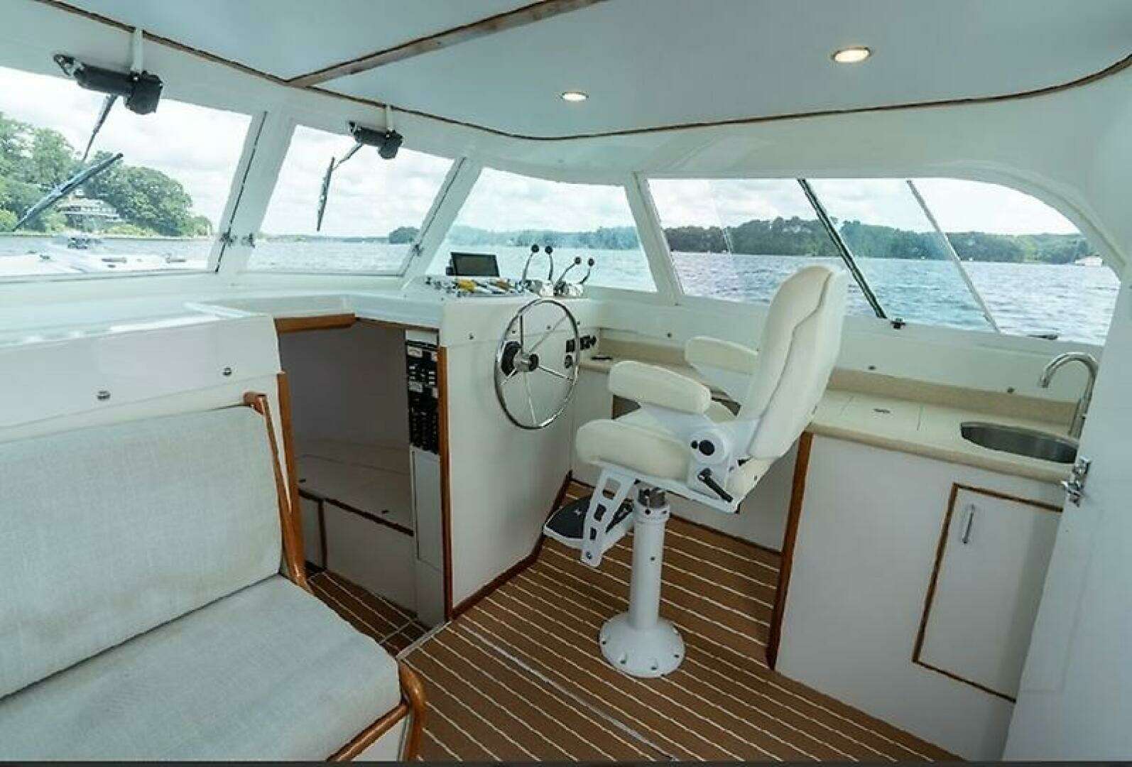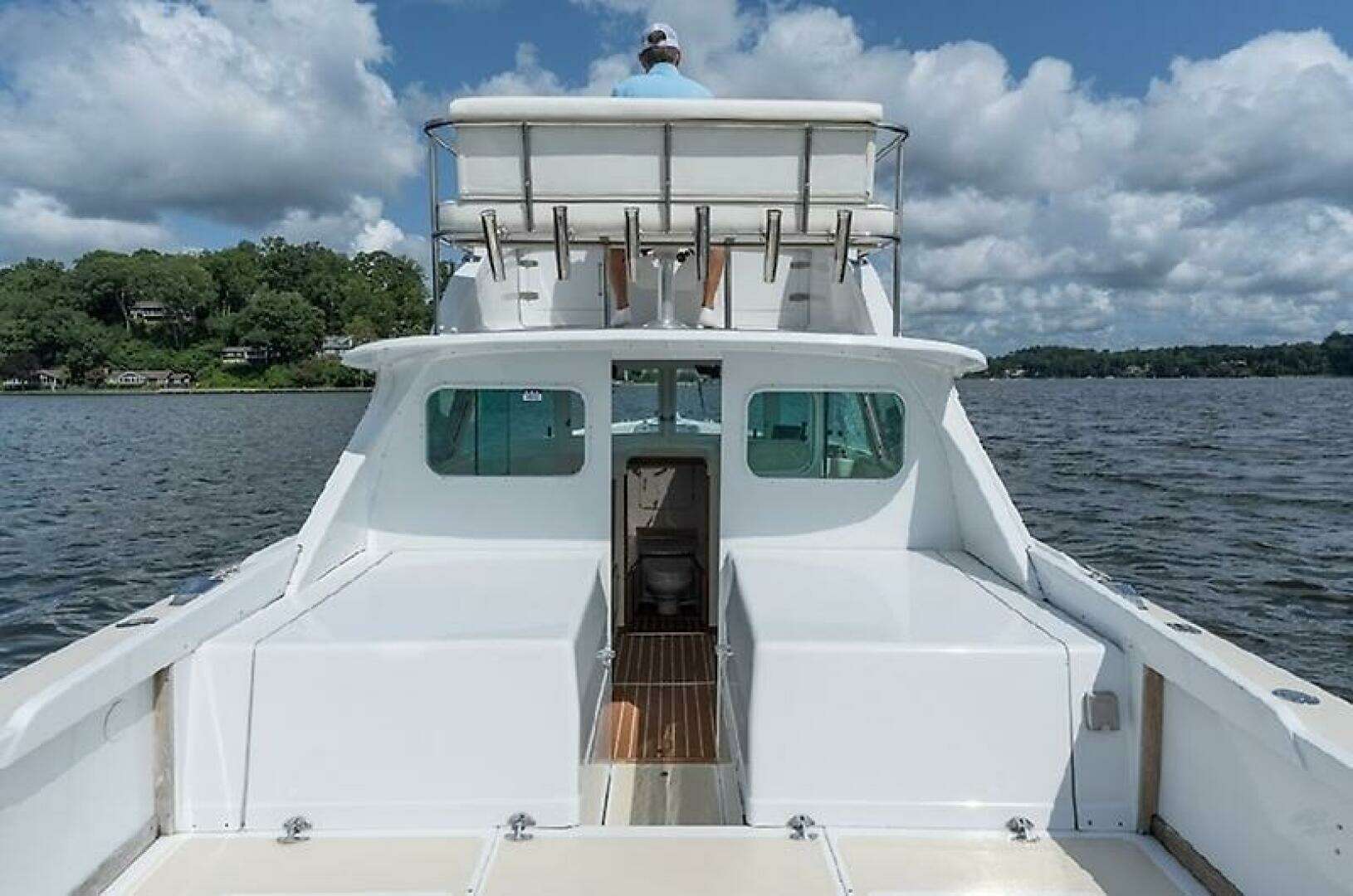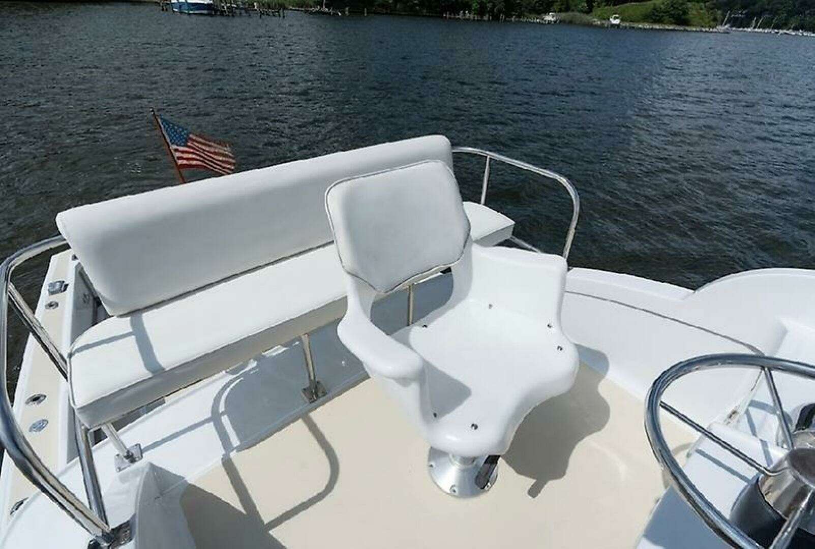 - Flybridge with Second Helm - Bench seating, rod holders, and helm chair