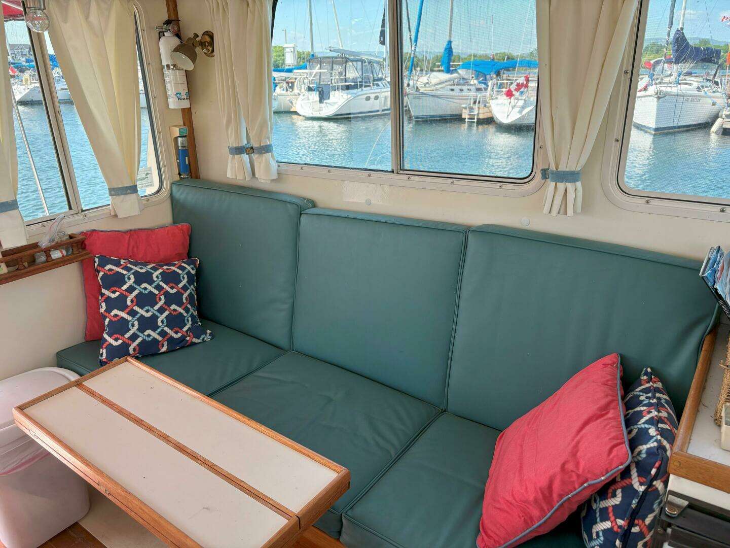 The layout is a galley up configuration. Helm is to starboard with storage & fridge opposite to port. A settee to port converts to a double berth. Drop leaf table is moveable. The galley runs aft behind the helm & has ample storage, a 2 burner propane stove & oven. Hot & cold pressure water to a single stainless steel sink.