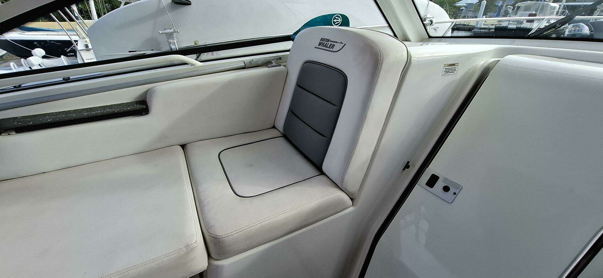 The interior is comprised of a forward seating area with a center table for dining. The table drops down to become a v-birth capable of sleeping 2 adults. There is a small galley to port and a head to starboard. There is also an aft birth behind the cabin steps that is capable of sleeping 2 adults. The cockpit has an L shaped seating area for guests and a single seat for the captain. The cockpit can be fully enclosed and features air conditioning. The aft deck has seats that retract into the gunwhales which allows for ample space to walk around while fishing. The swim deck features a retractable stainless steel ladder for getting in and out of the water.